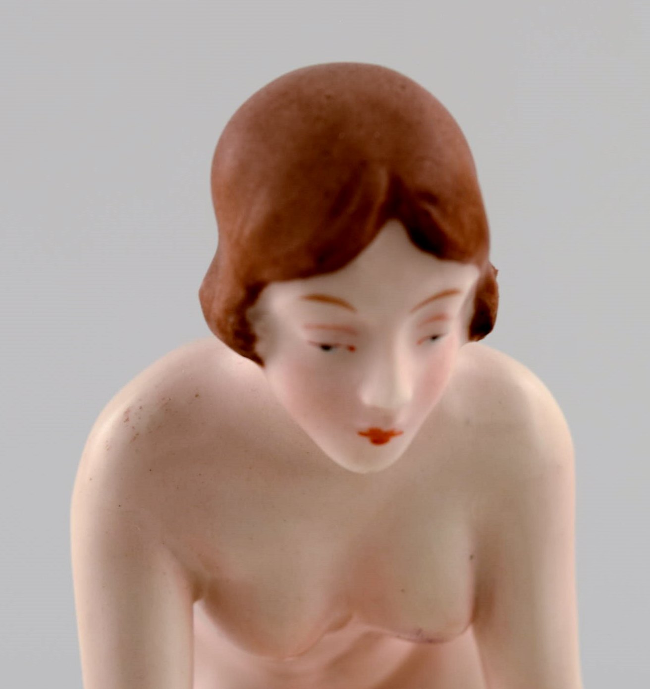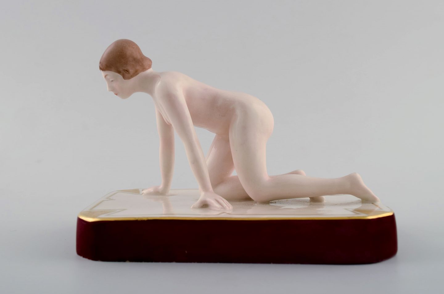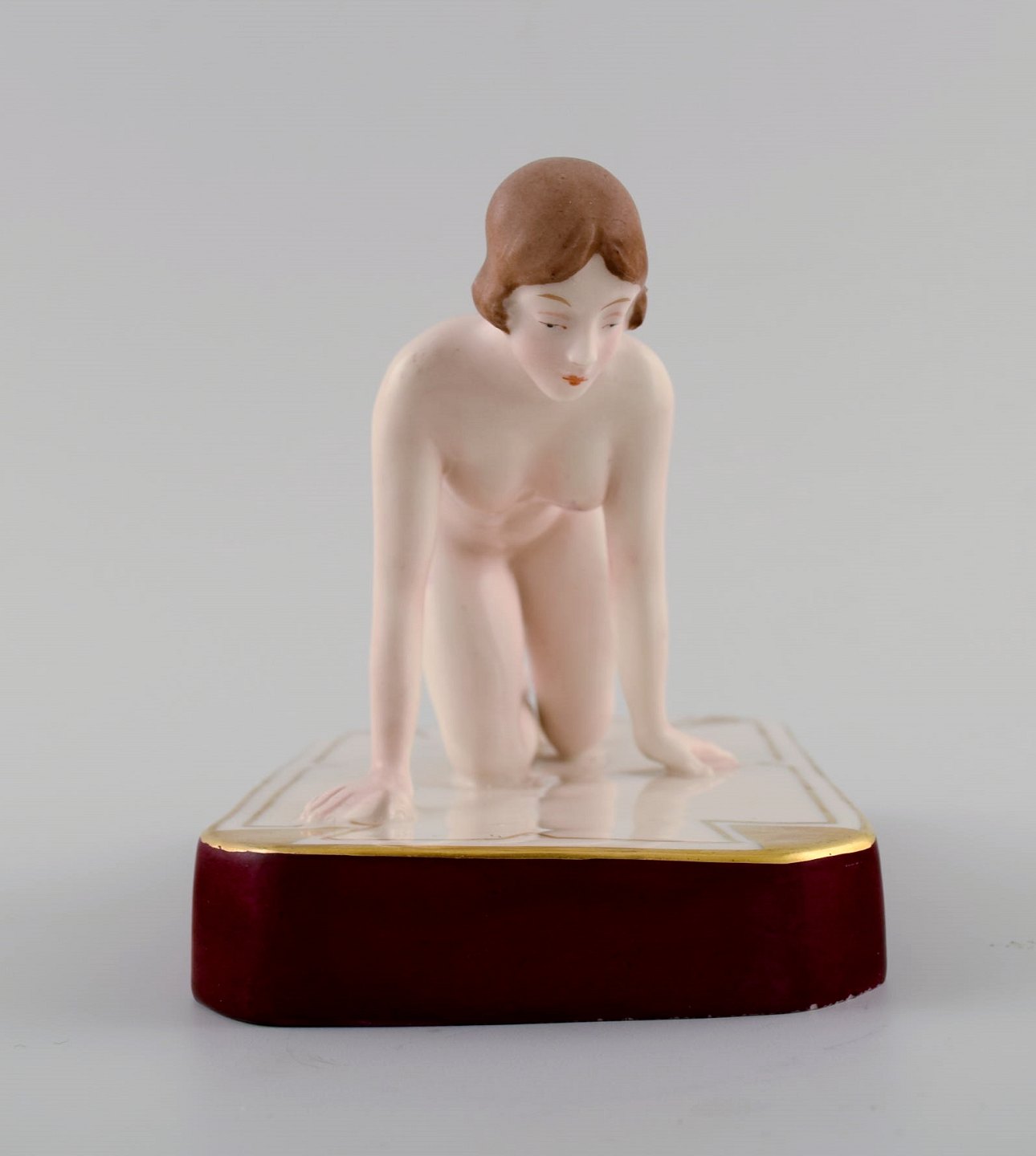 Art deco Royal Dux nøgen kvinde på sokkel, porcelæn. Måler 13,5 x 10,5 cm. x 9 cm. Stemplet. I perfekt stand.