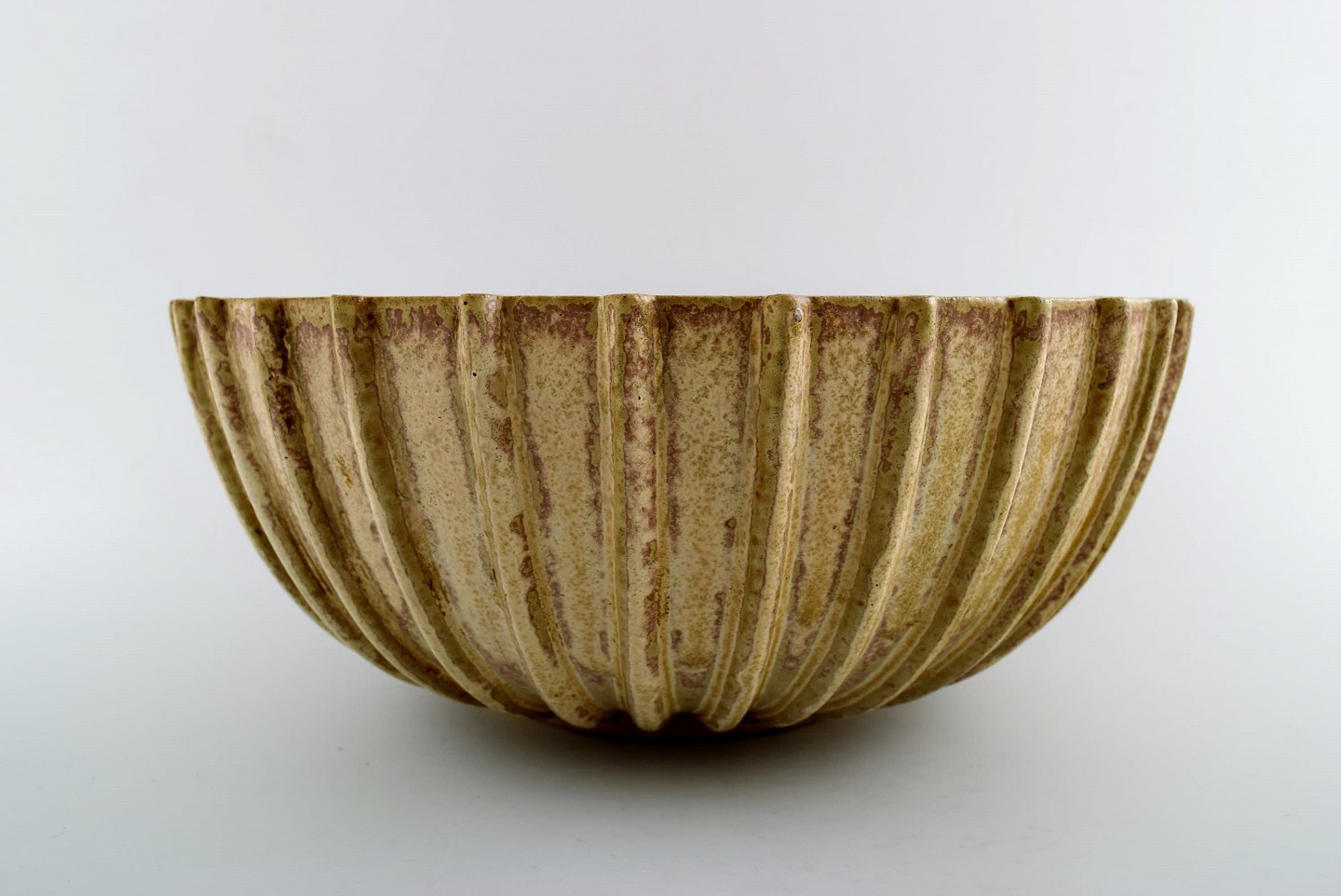 Arne Bang. Bordskål af stentøj med kanneleret korpus dekoreret med brun/okker spættet glasur.