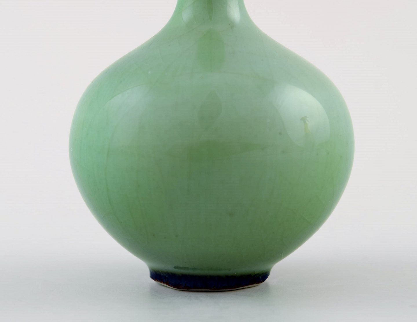 Friberg studiohand keramikvase, unika. Fantastisk glasur i grønne nuancer. Stemplet Perfekt. 1. sortering. Måler: 9,5 cm. x 5 cm.