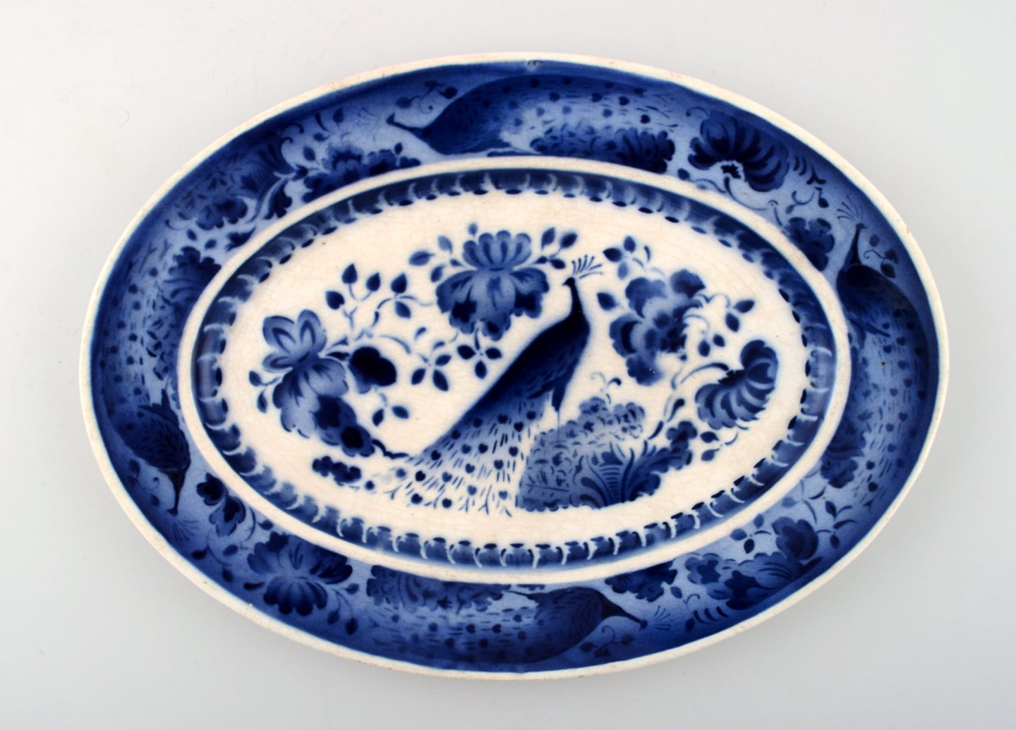 Påfuglestel fra Københavns fajancefabrik/Aluminia. Stort ovalt fad i fajance. 2 stk. på lager. Vi har mange dele på lager. Måler : 28 cm. x 20 cm. I flot stand.