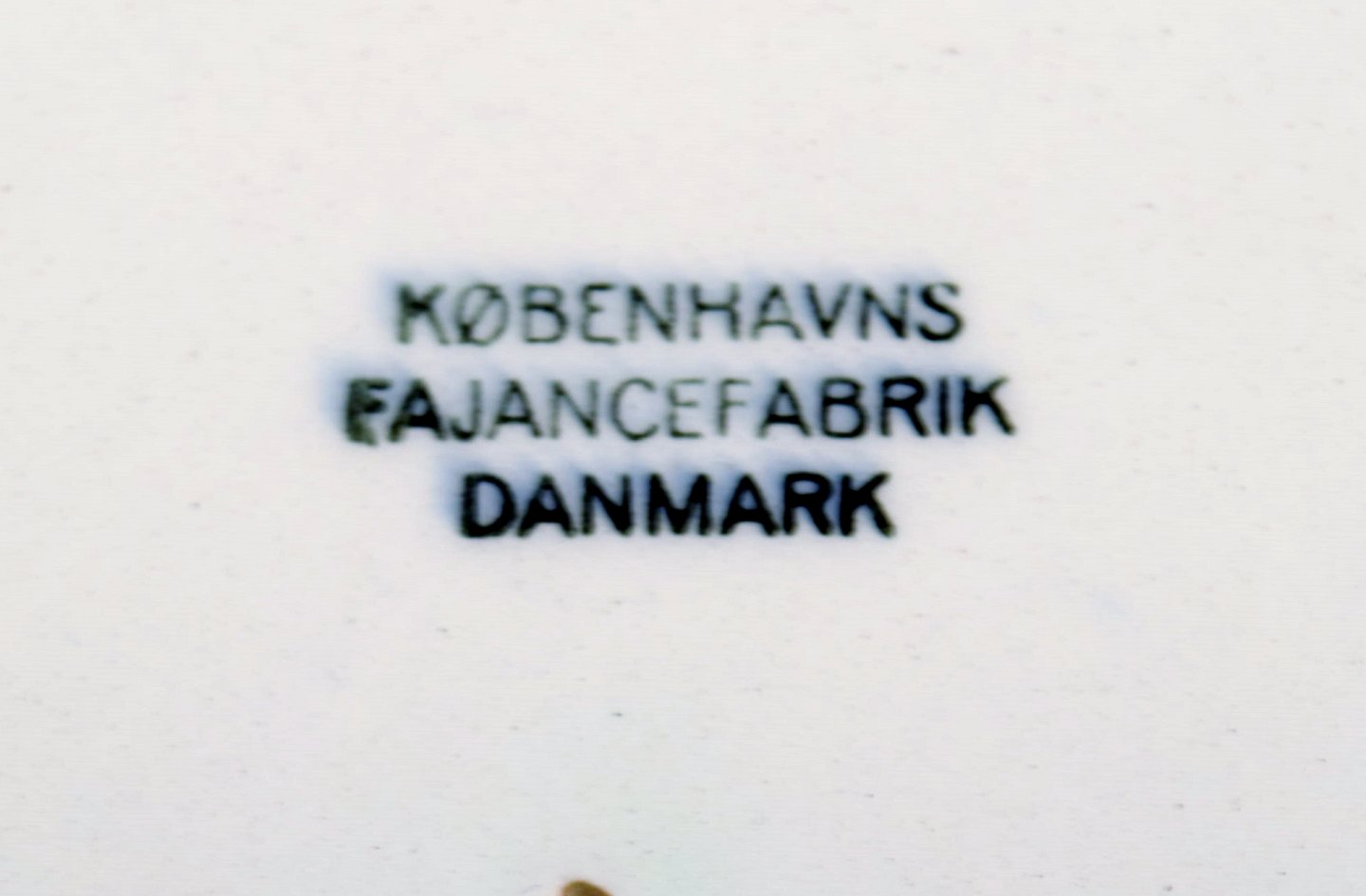 Påfuglestel fra Københavns fajancefabrik/Aluminia. Stort rundt fad i fajance. Vi har mange dele på lager. Måler : 33,5 cm. I flot stand.