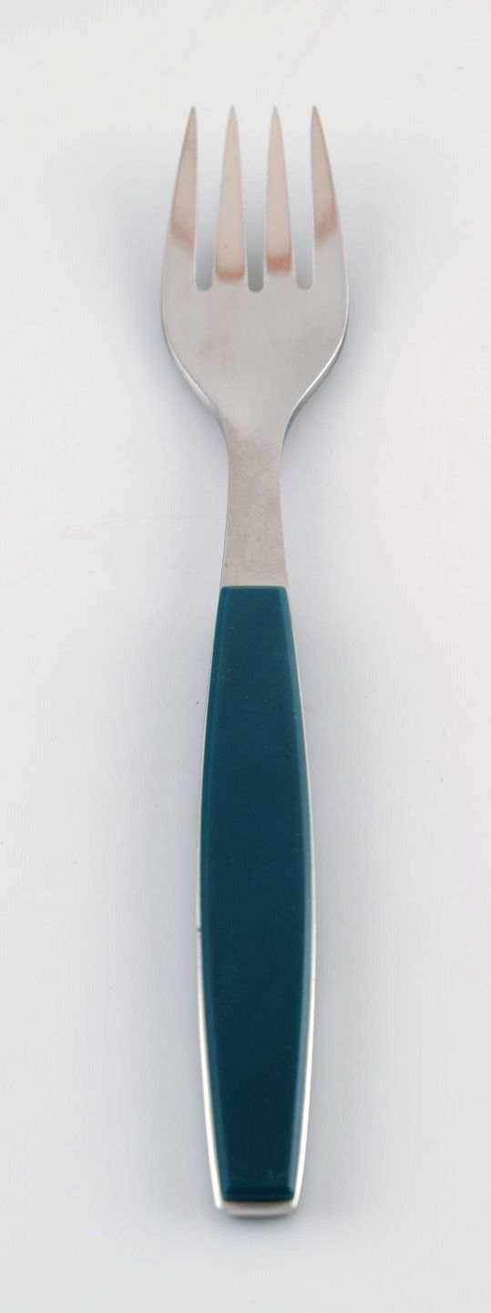 14 dinner forks, Henning Koppel. Strata cutlery stainless steel and green plastic. Designed by Georg Jensen. In very good condition. Danish design 1970s. 19,5 cm. long.