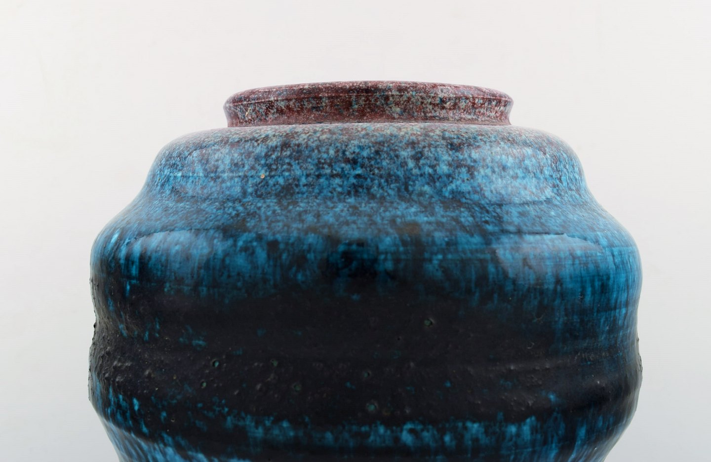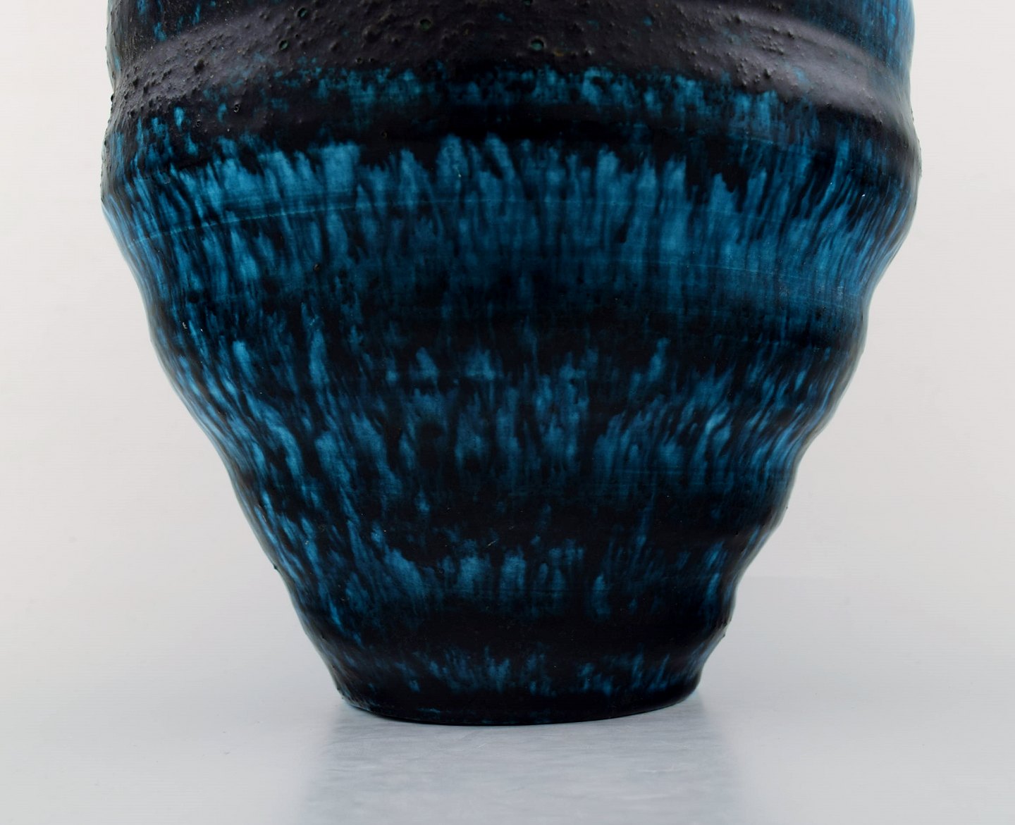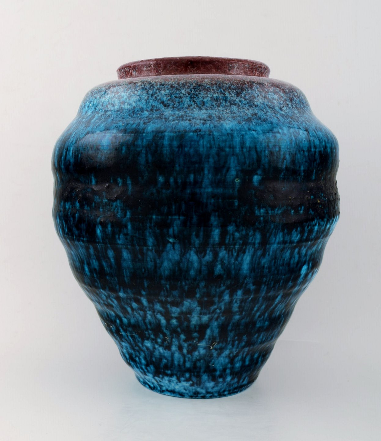 Accolay, Fransk keramikvase. Turkis, stilrent design med striber. Stemplet. Modelnummer 19. 1950/60´erne. Smuk turkis glasur. Måler 22 cm. x 20 cm. I perfekt stand.