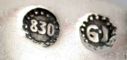 Georg Jensen : Tidlig sennepskrukke af sølv med indsats af facetslebet klart glas, med tilhørende ske.