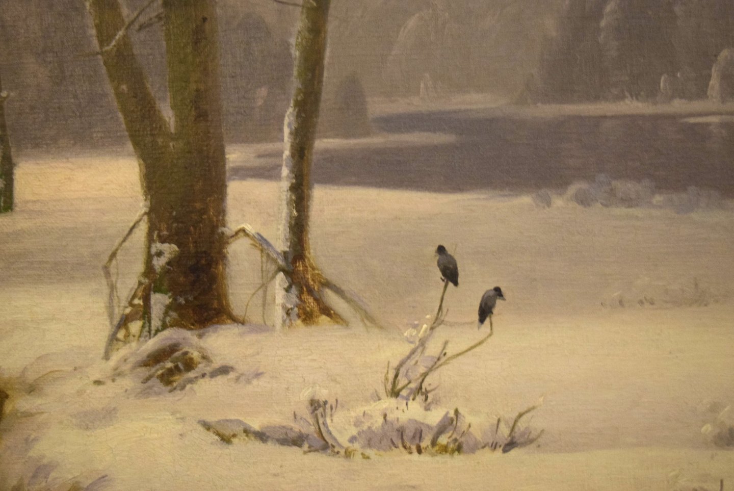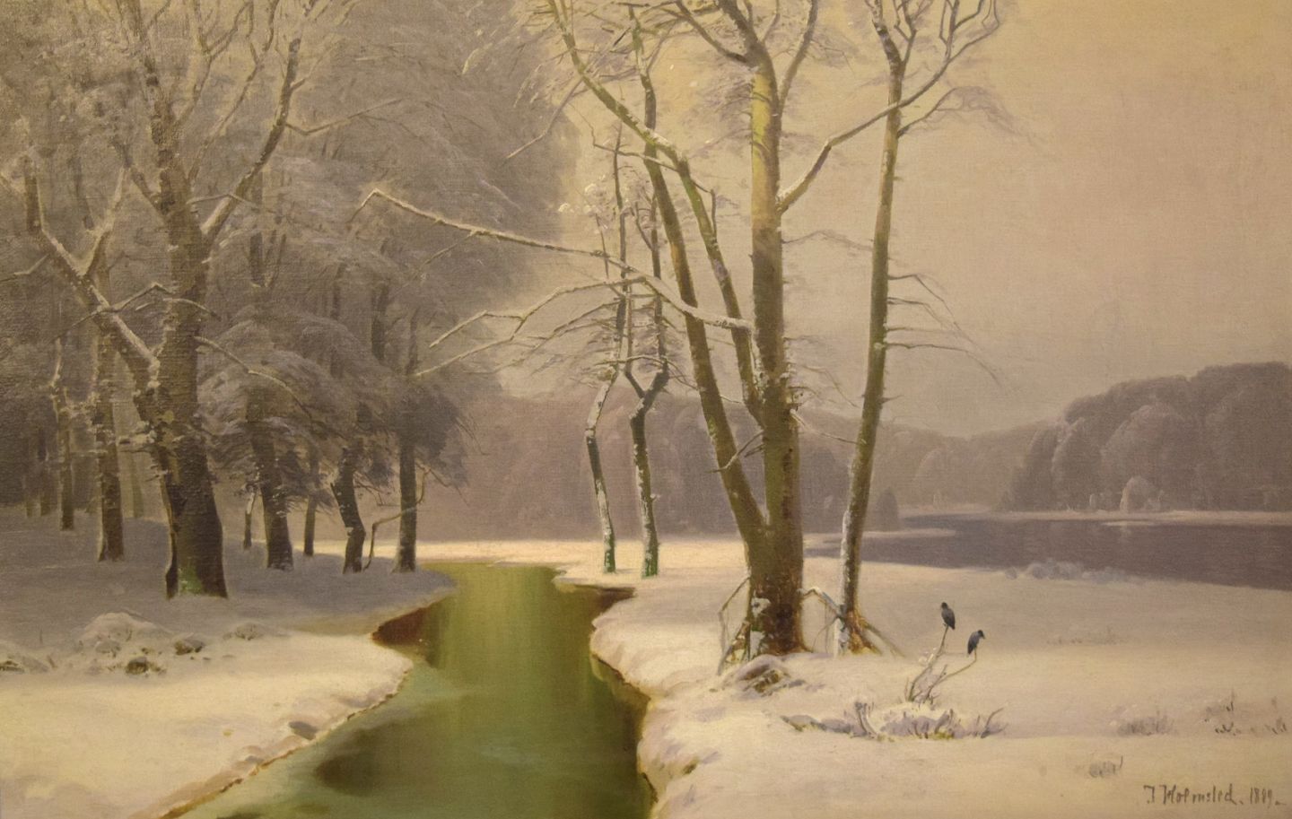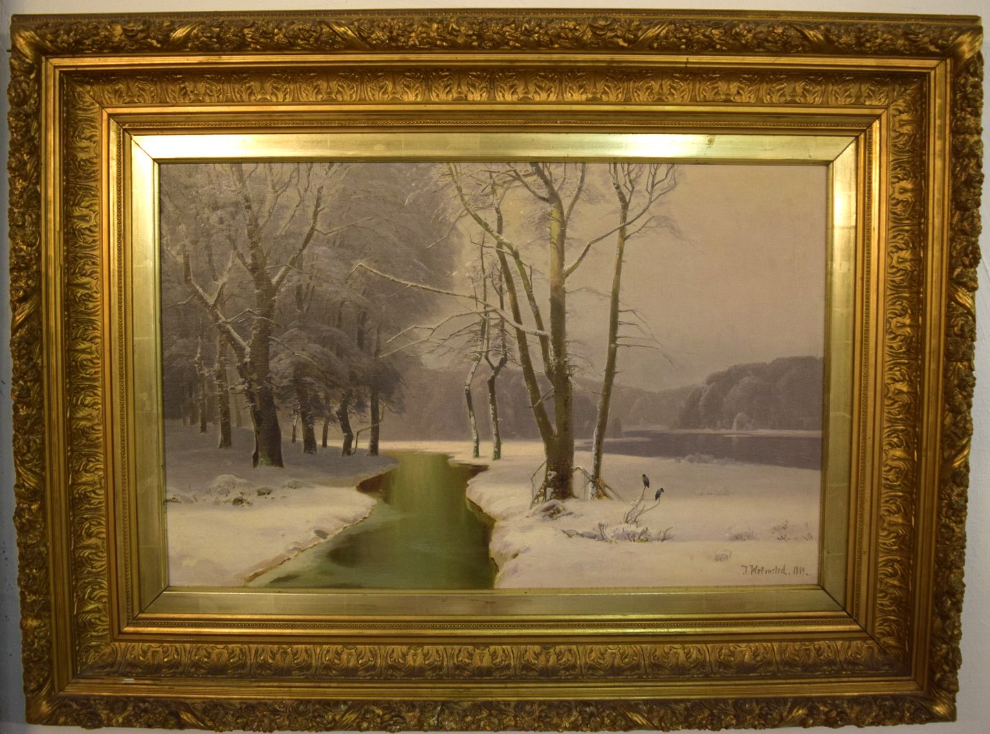 J. Holmsted, skandinavisk maler. Olie på lærred. Vinterlandskab fra 1889 i stor og imponerende guldramme. Måler : 80 cm. x 51 cm. Rammen måler 18 cm. Signeret. I flot stand.