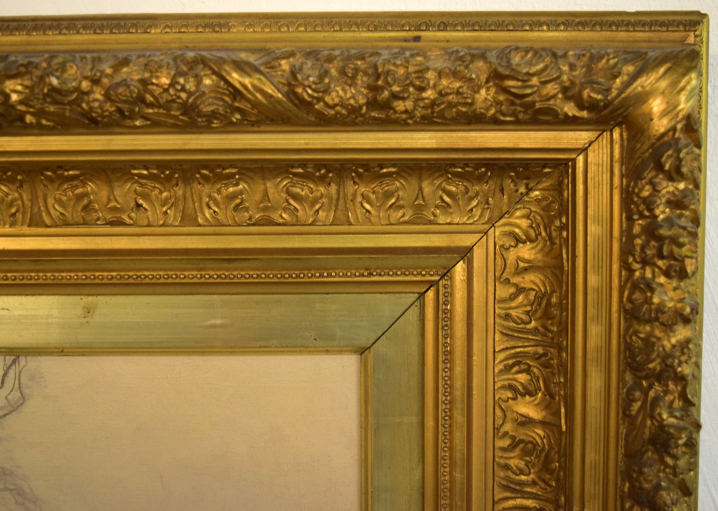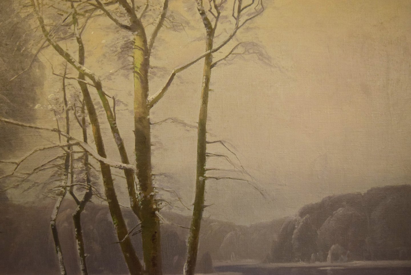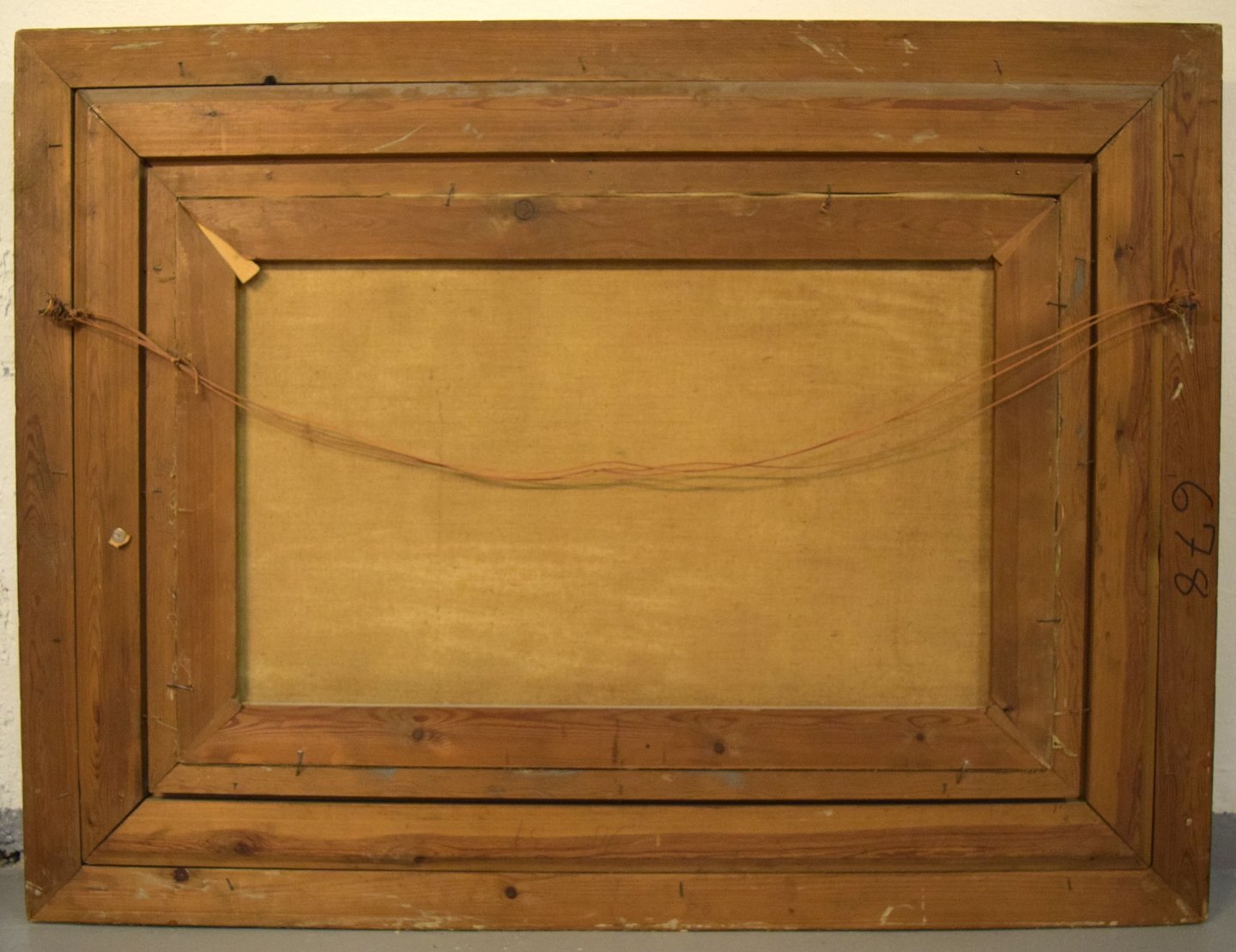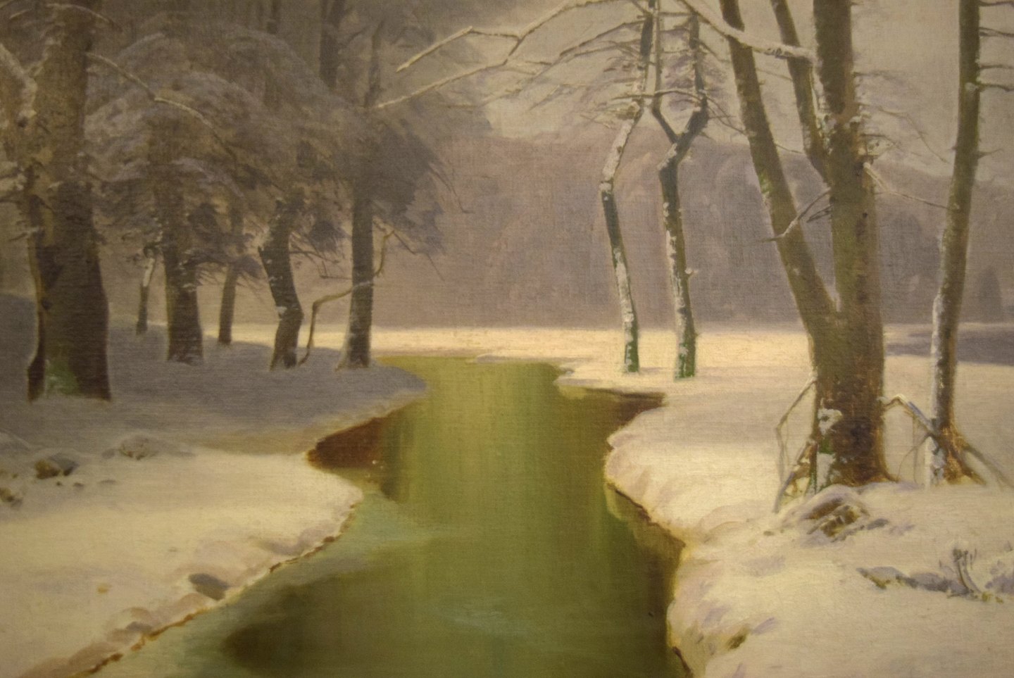 J. Holmsted, skandinavisk maler. Olie på lærred. Vinterlandskab fra 1889 i stor og imponerende guldramme. Måler : 80 cm. x 51 cm. Rammen måler 18 cm. Signeret. I flot stand.