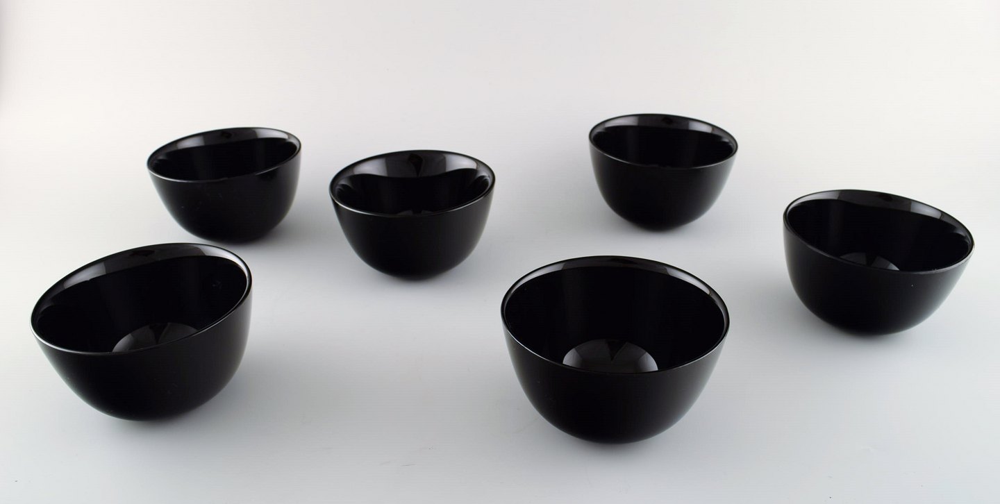 Orrefors "Colora" 6 skåle i kunstglas i sort. Designet af Sven Palmqvist. Måler : 11 cm. x 6,5 cm. I perfekt stand.