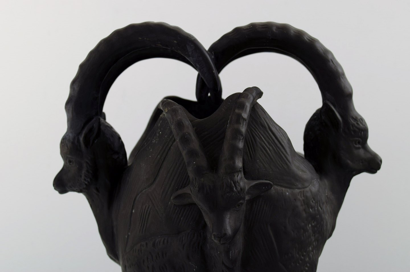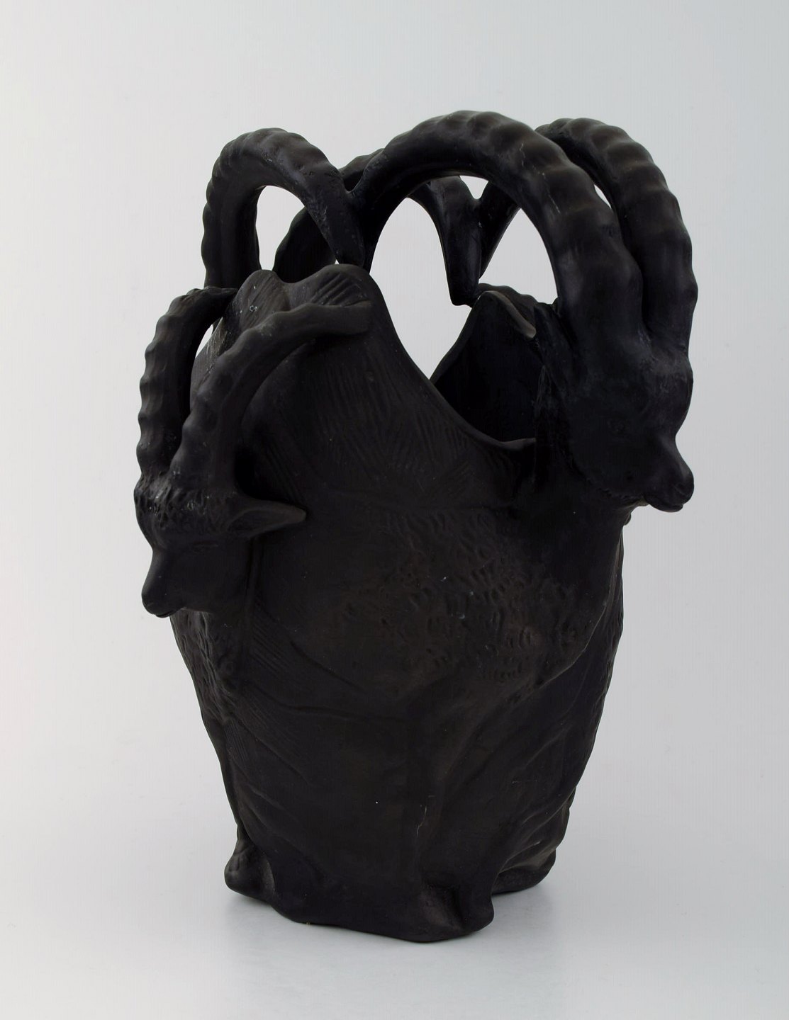 Hjorth skønvirke vase i terracotta, stenbukke. Ca. 1900´erne. Måler : 23 cm. x 21 cm. I perfekt stand. Stemplet.