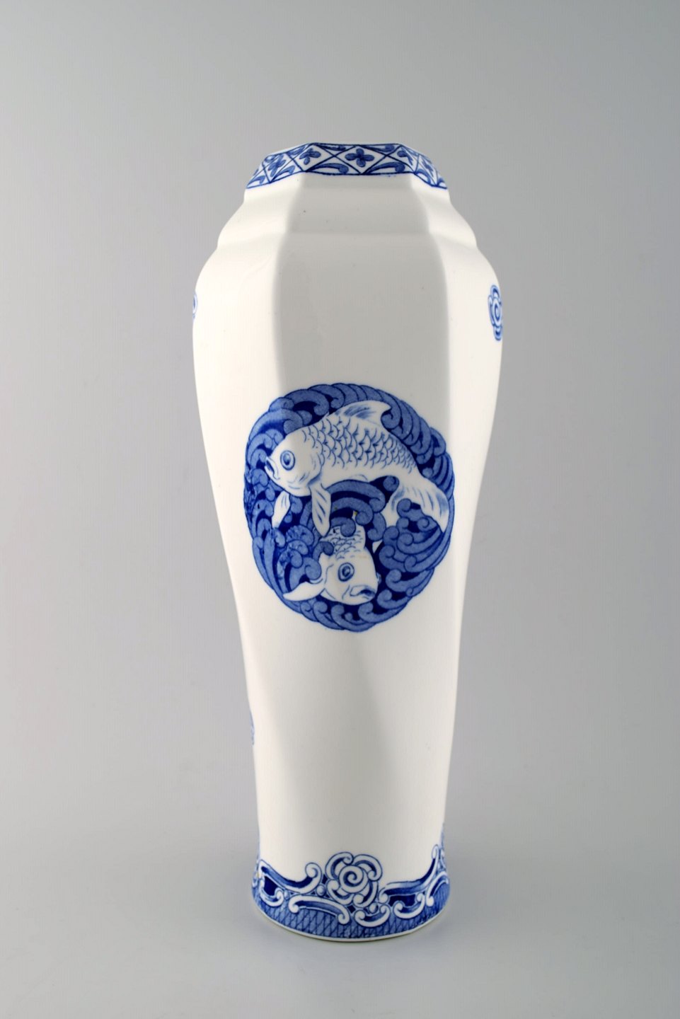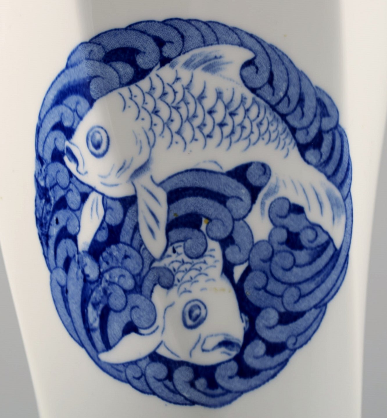 Rörstrand, stor vase i fajance dekoreret med fisk. Måler : 36 cm. x 16 cm. I perfekt stand. Stemplet. 1920´erne.