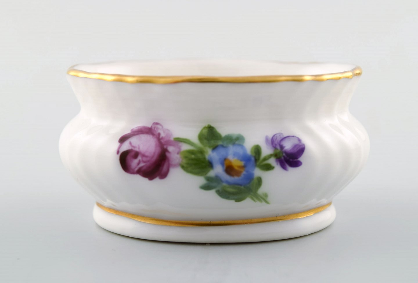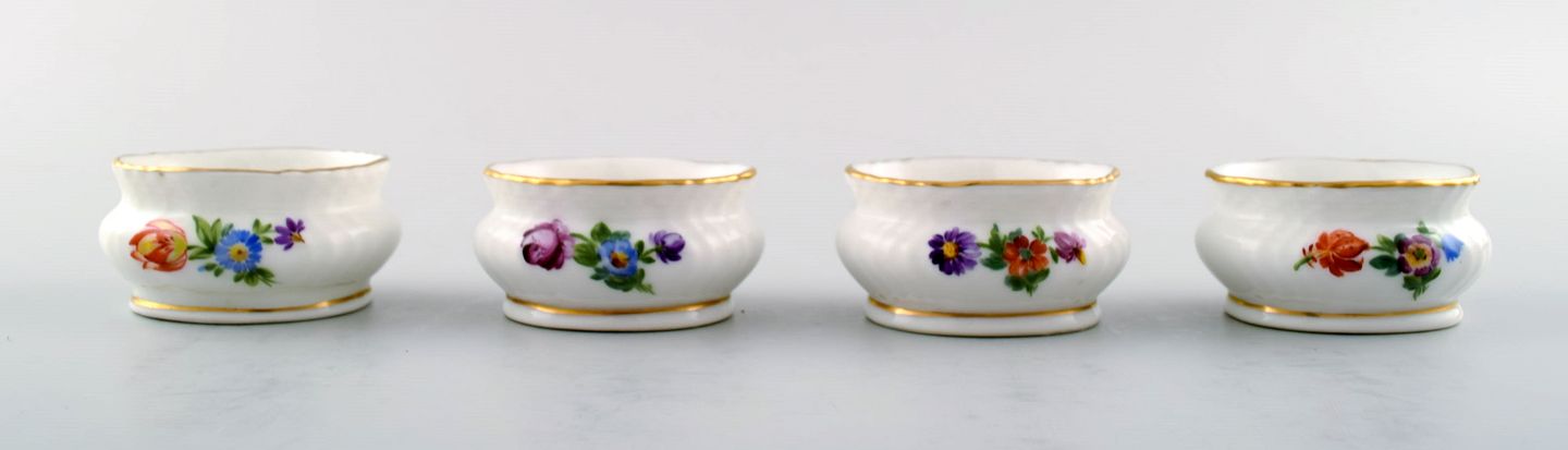 Royal Copenhagen Let Saksisk Blomst, fire saltkar. Dekorationsnummer 493/1646. 1. sortering. Måler 6 cm. x 3 cm. Perfekt stand.