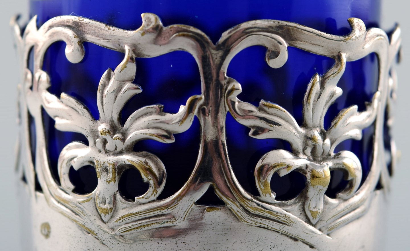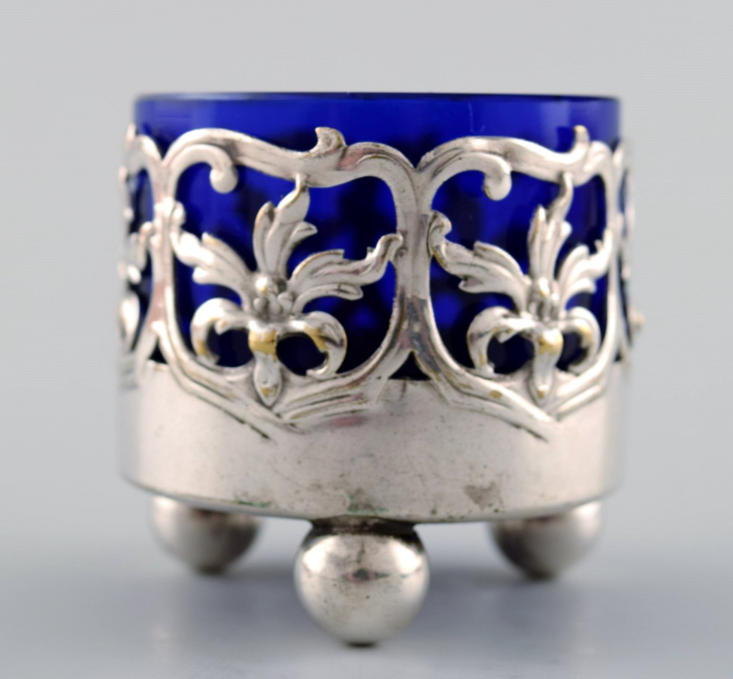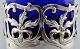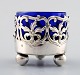 Et par engelske saltkar med glasindsatser i blåt af engelsk nysølv. Stemplet. Ca. 1900. Måler : 5 cm. x 4,5 cm. I flot stand.