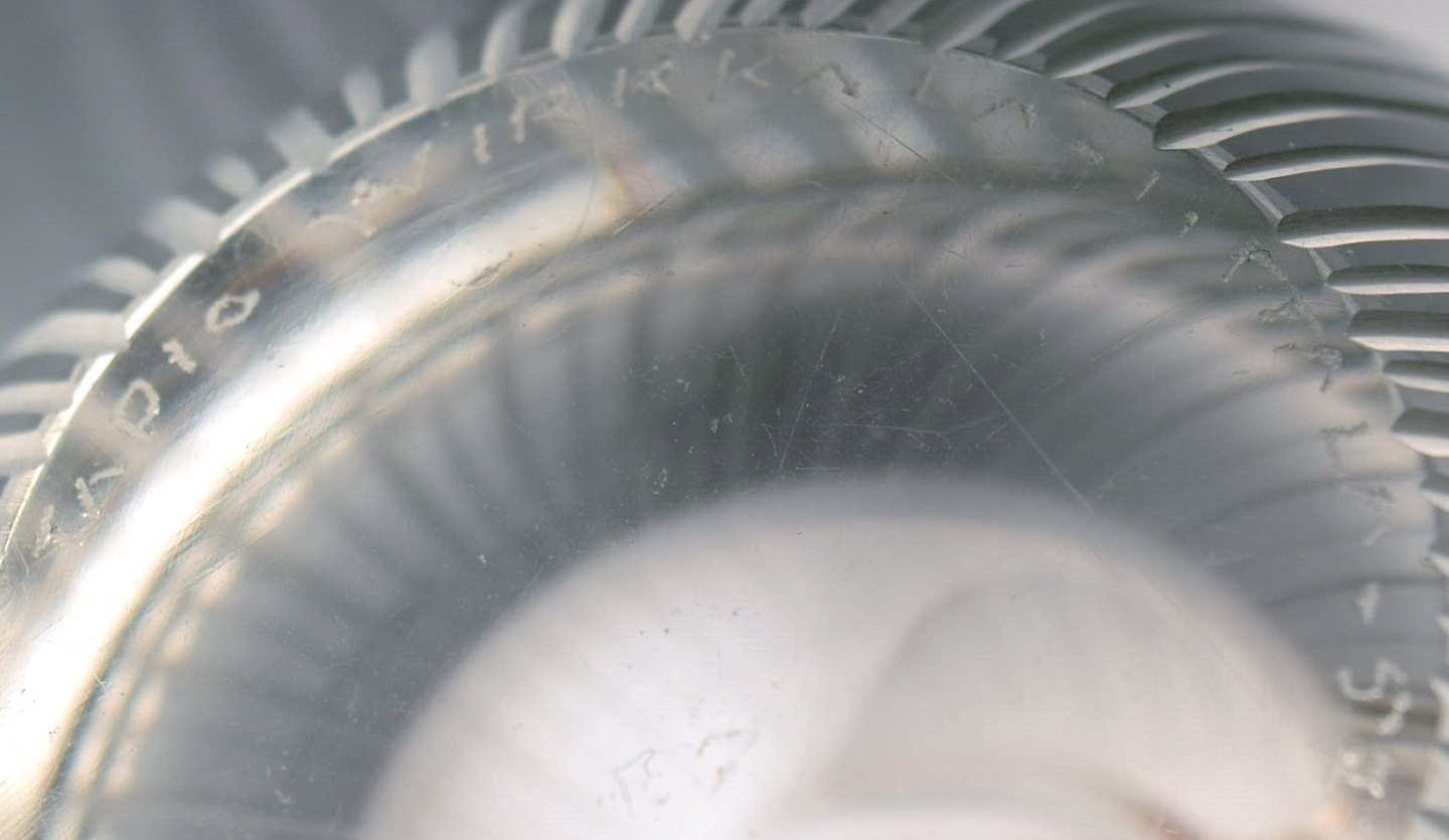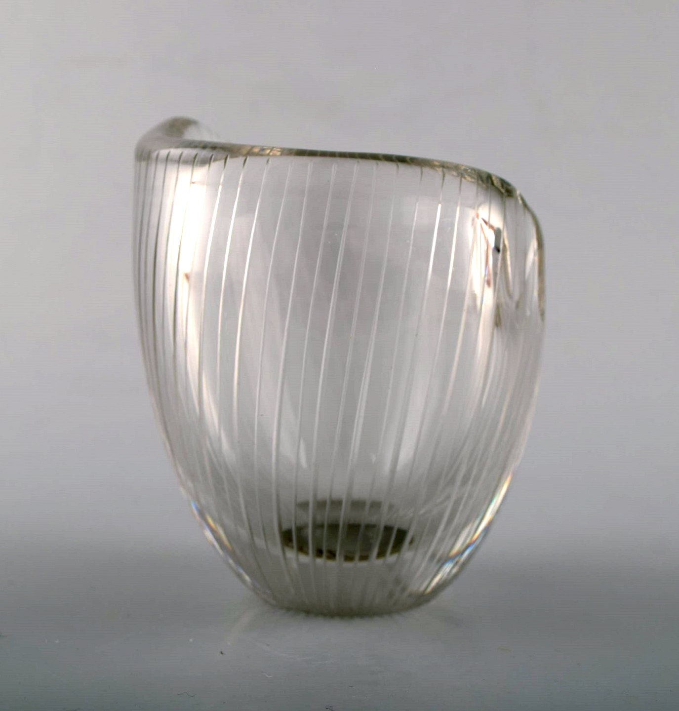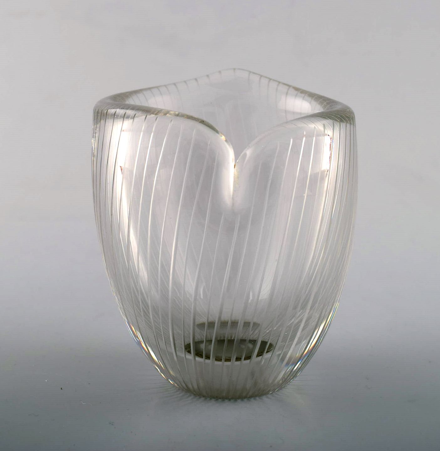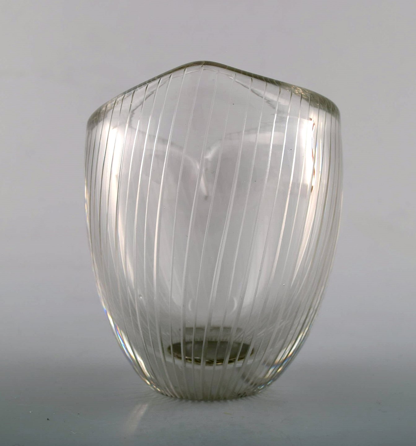 Tapio Wirkkala for Iittala. Klar kunstglas vase med indgraveret dekoration i form af striber. Signeret Tapio Wirkkala, Iittala. Mål 9,5 x 8,5 cm. I perfekt stand.