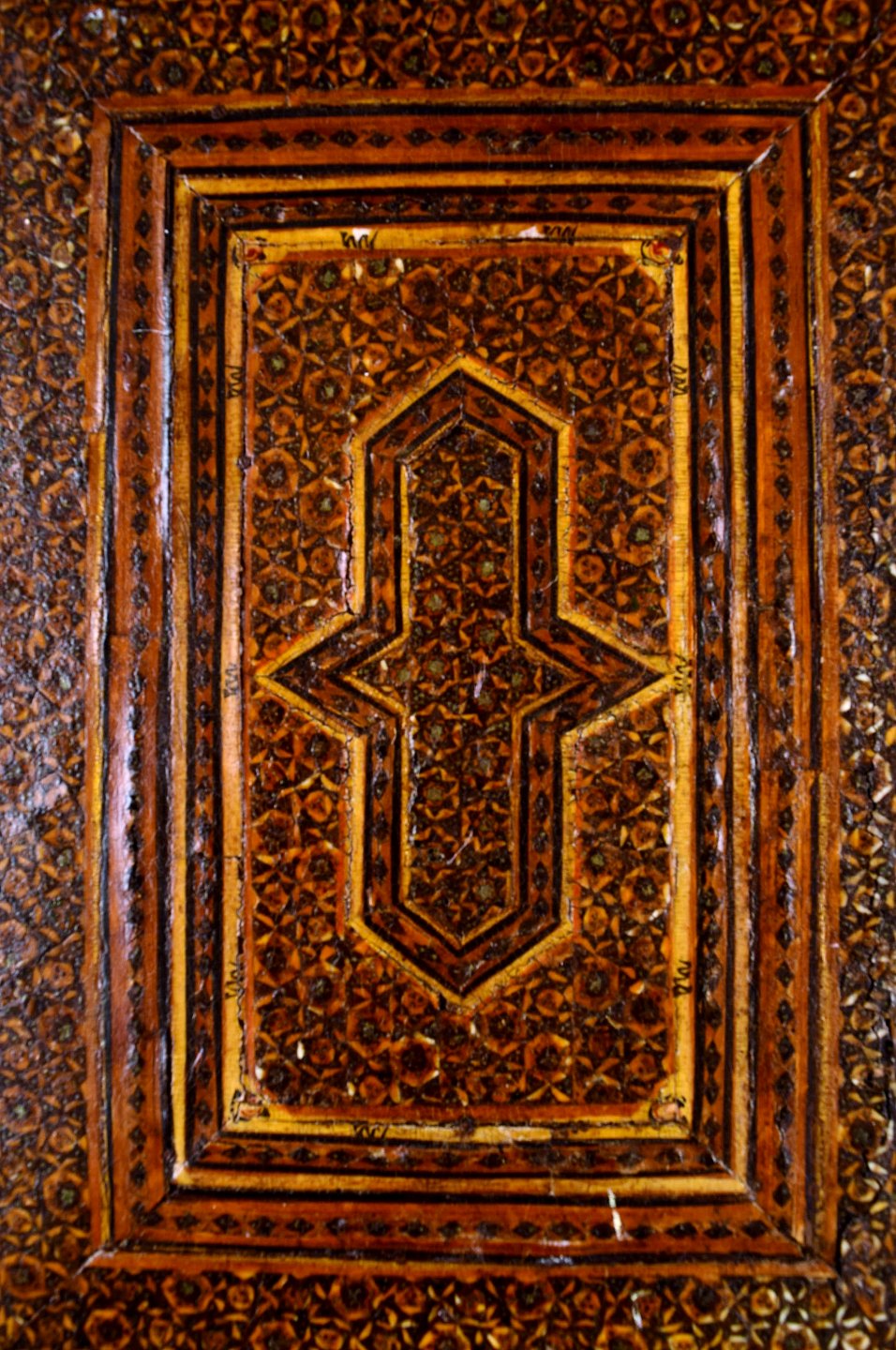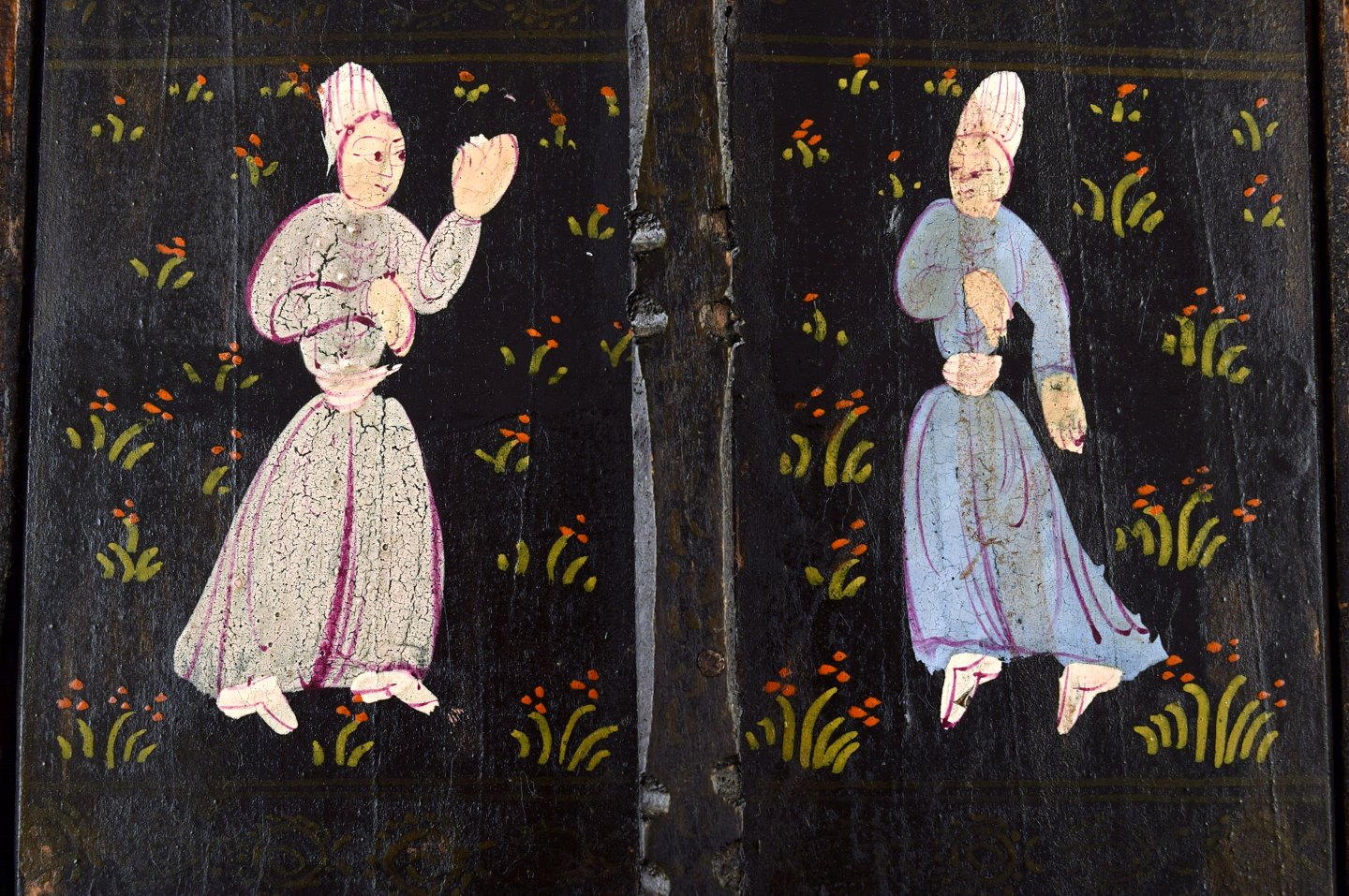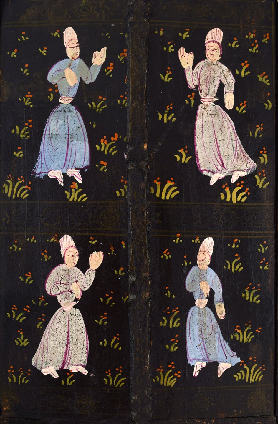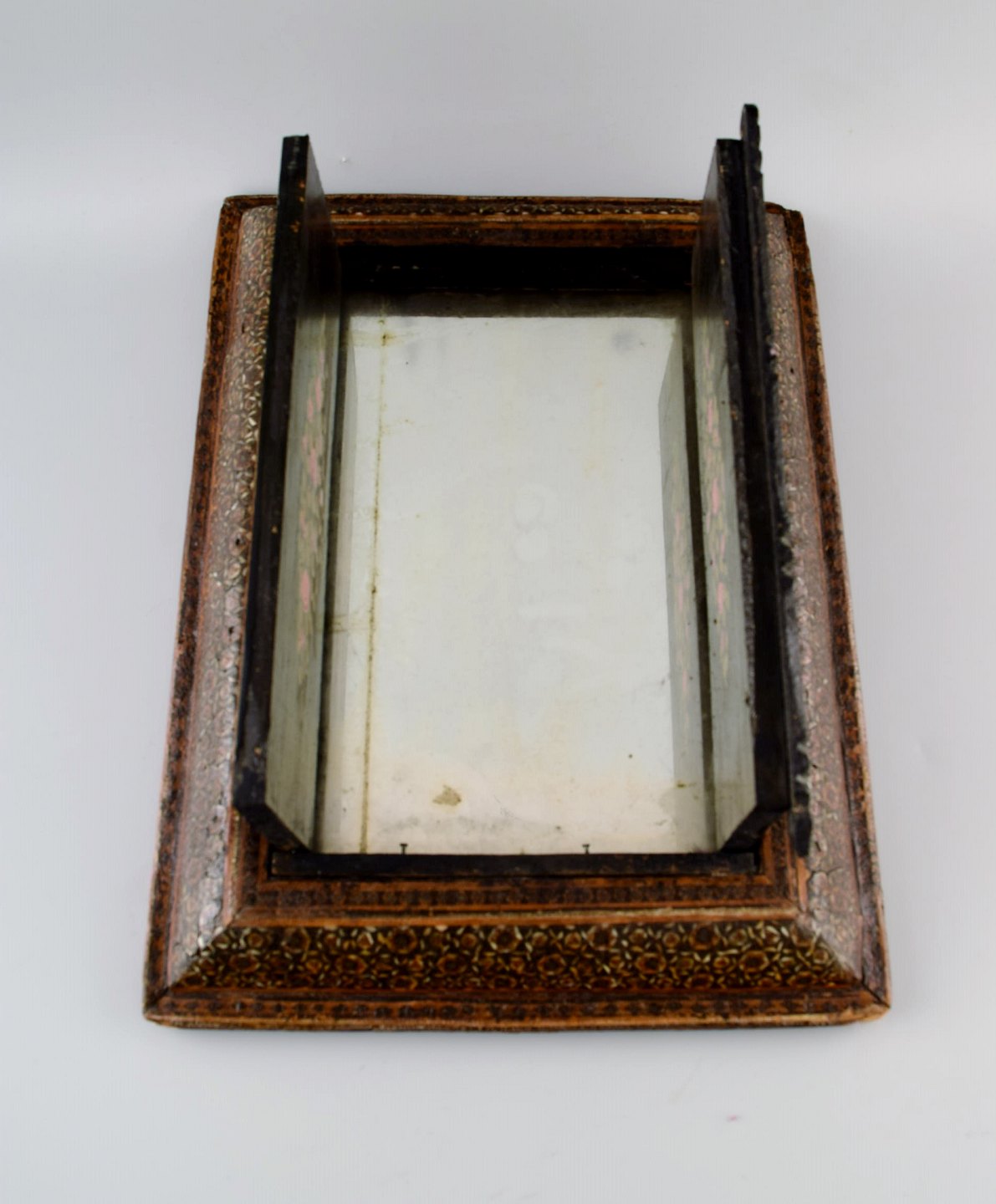 Antikt Persisk rejsespejl, intarsia arbejde, dansende personer, 1800 tallet. Måler : 35 cm. x 26 cm. I god stand, mindre afslag på bagsiden.