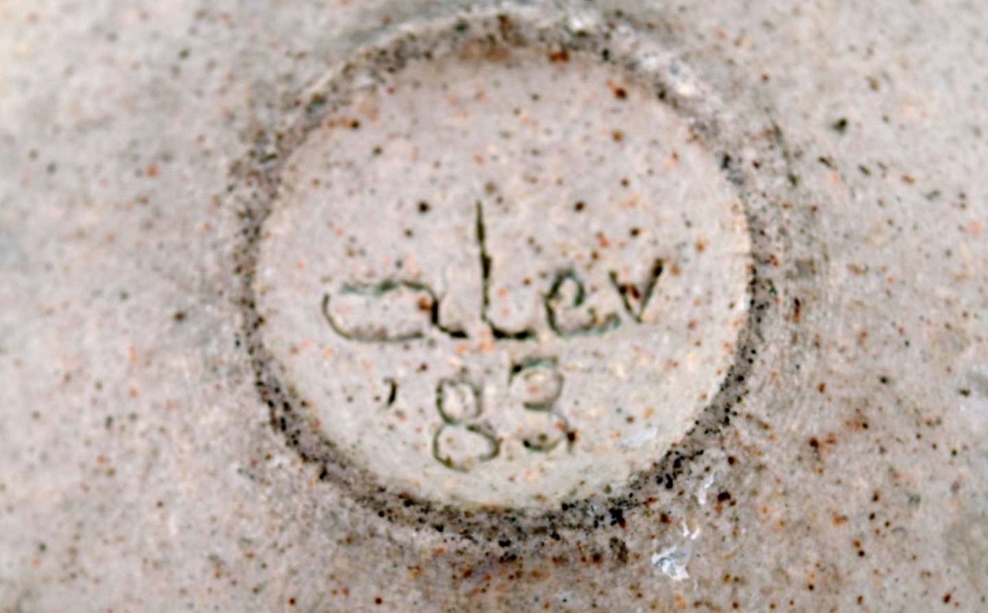 Alev Ebüzziya Siesbye (f. 1938). Meget stor unika skål af stentøj, dekoreret med orangerød, geometrisk mønster, svungen kant.