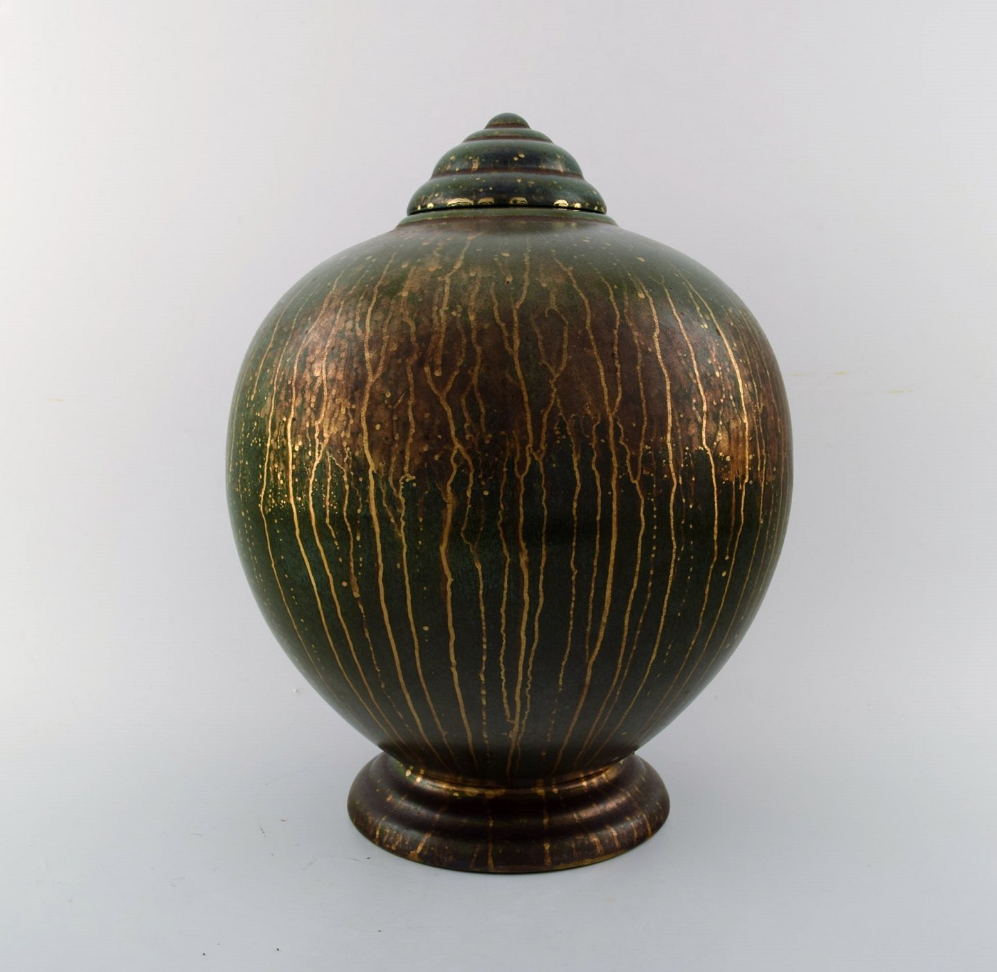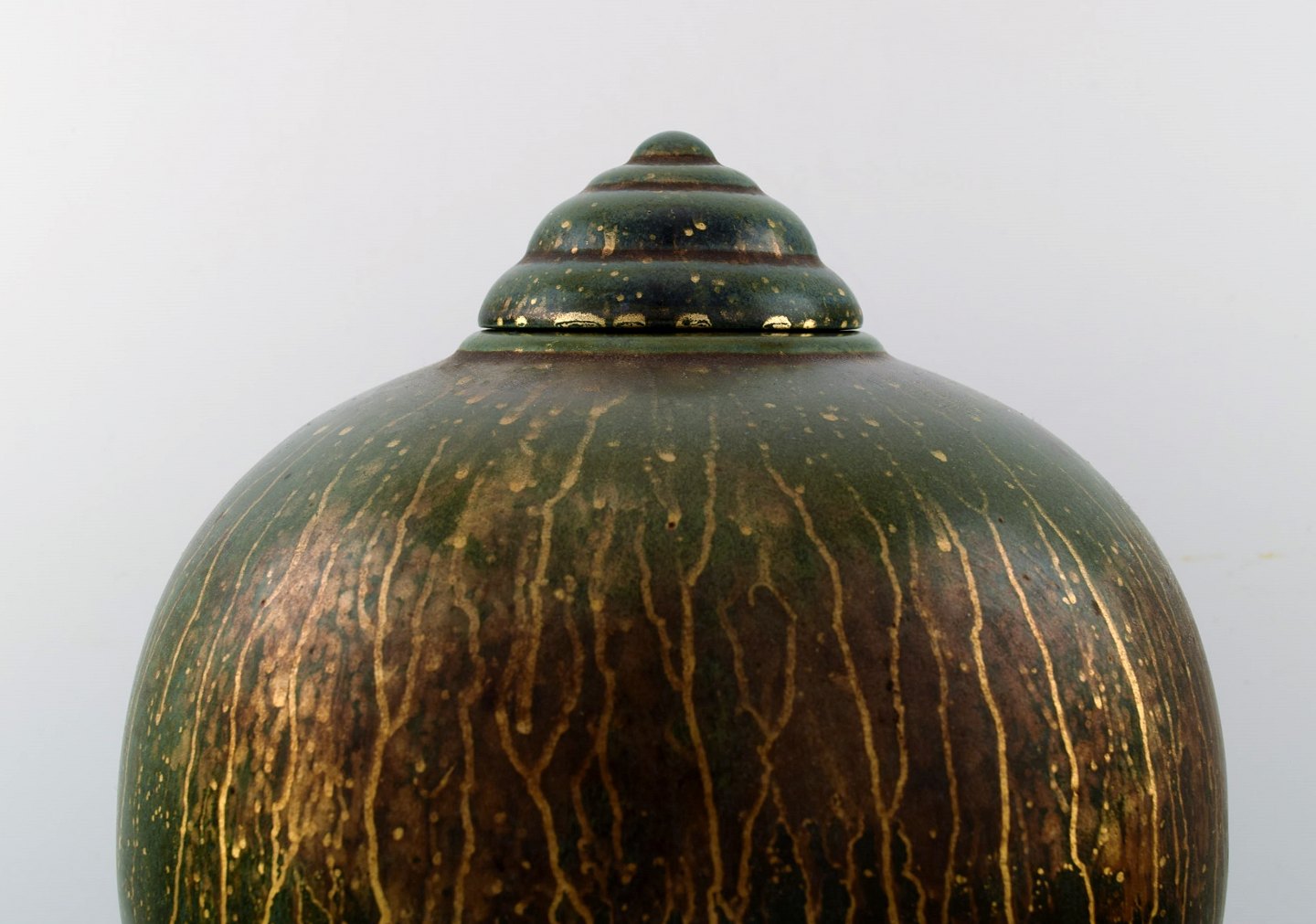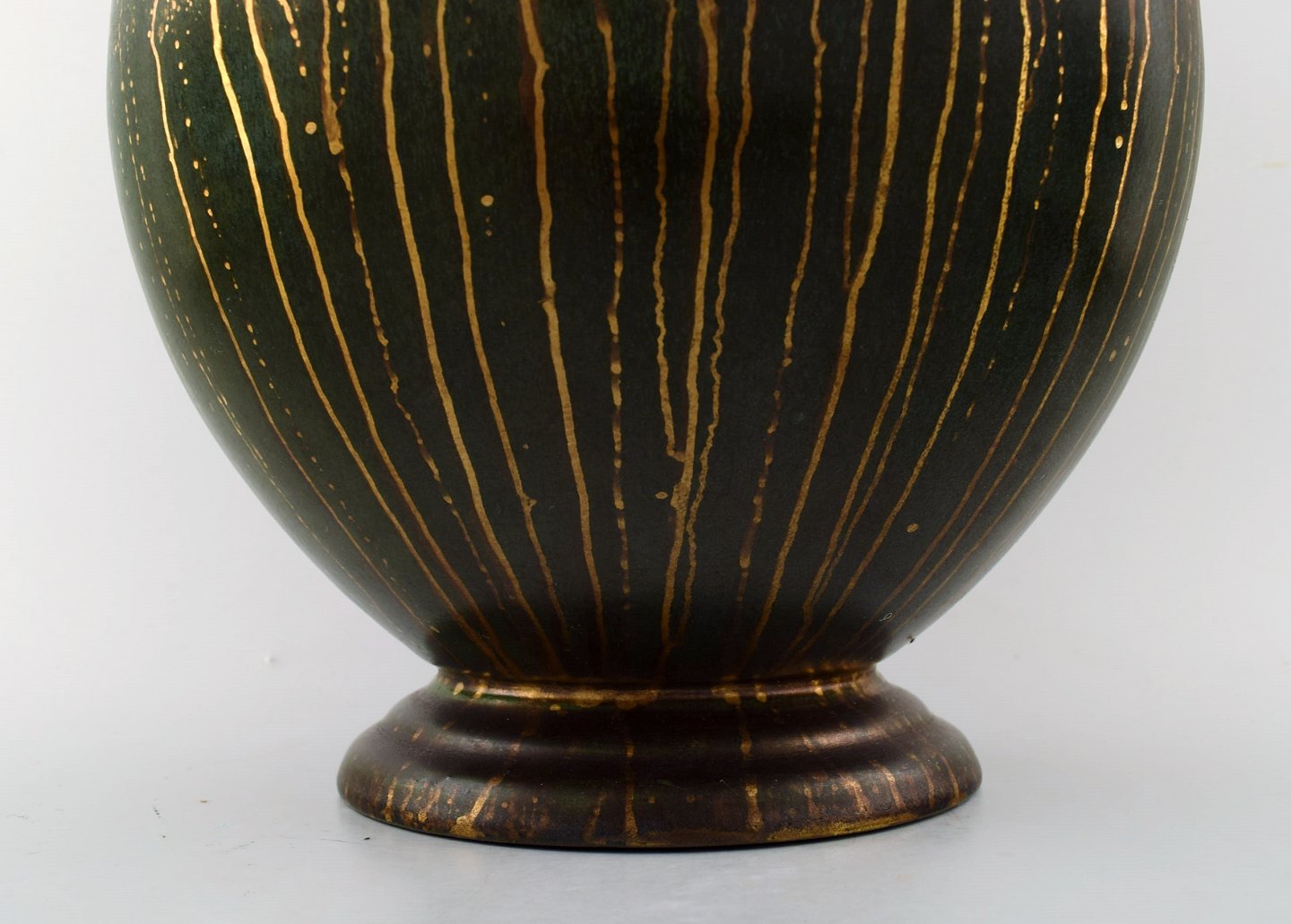 Lucien BRISDOUX (1878-1963) Frankrig. Art Deco keramik lågvase. Unika arbejde. Smuk grønlig glasur med guld dekoration. Stemplet. I perfekt stand. Måler : 31 cm. x 22 cm.