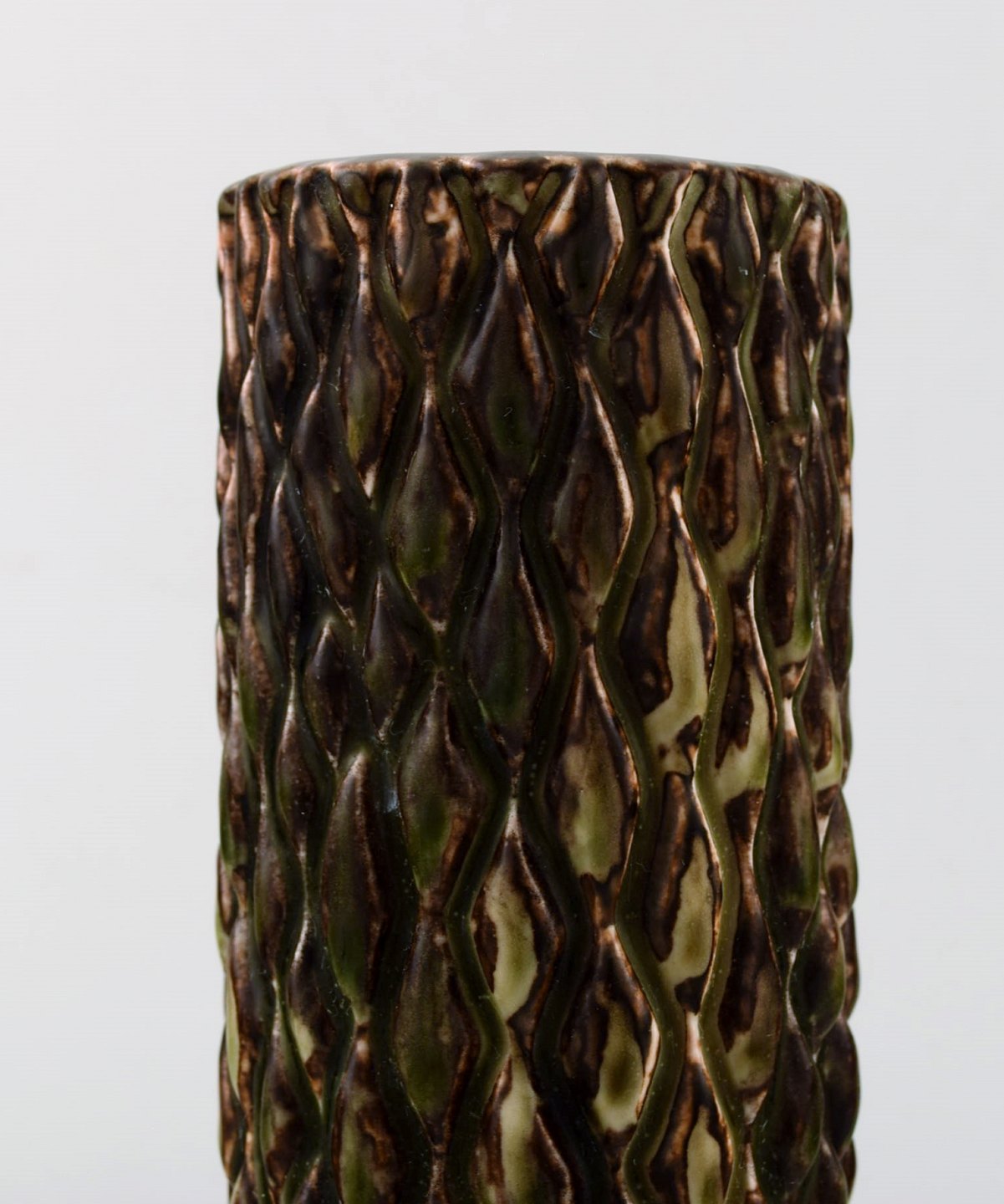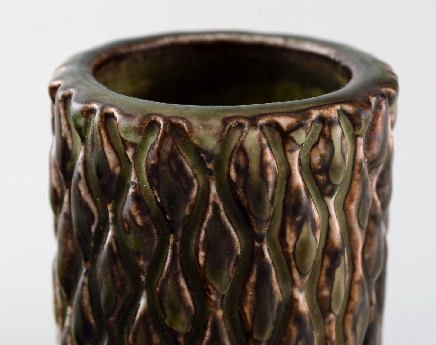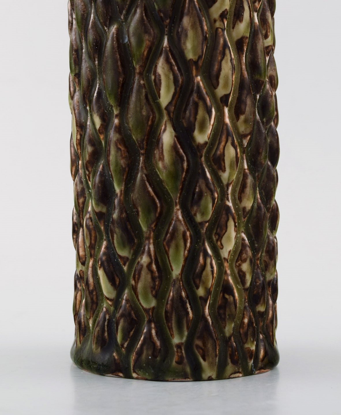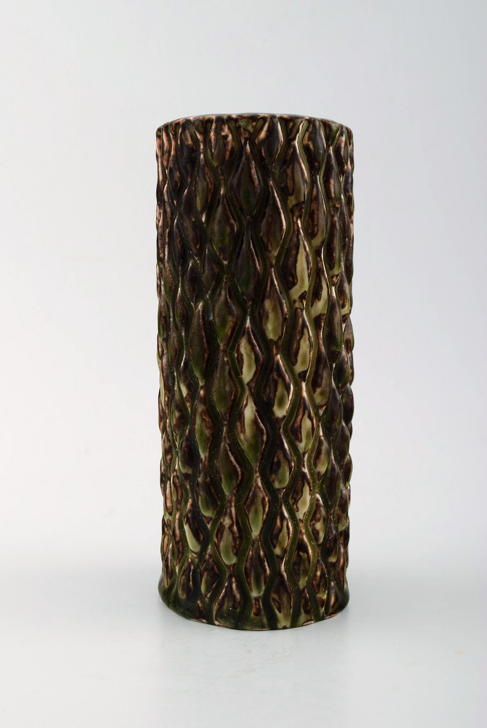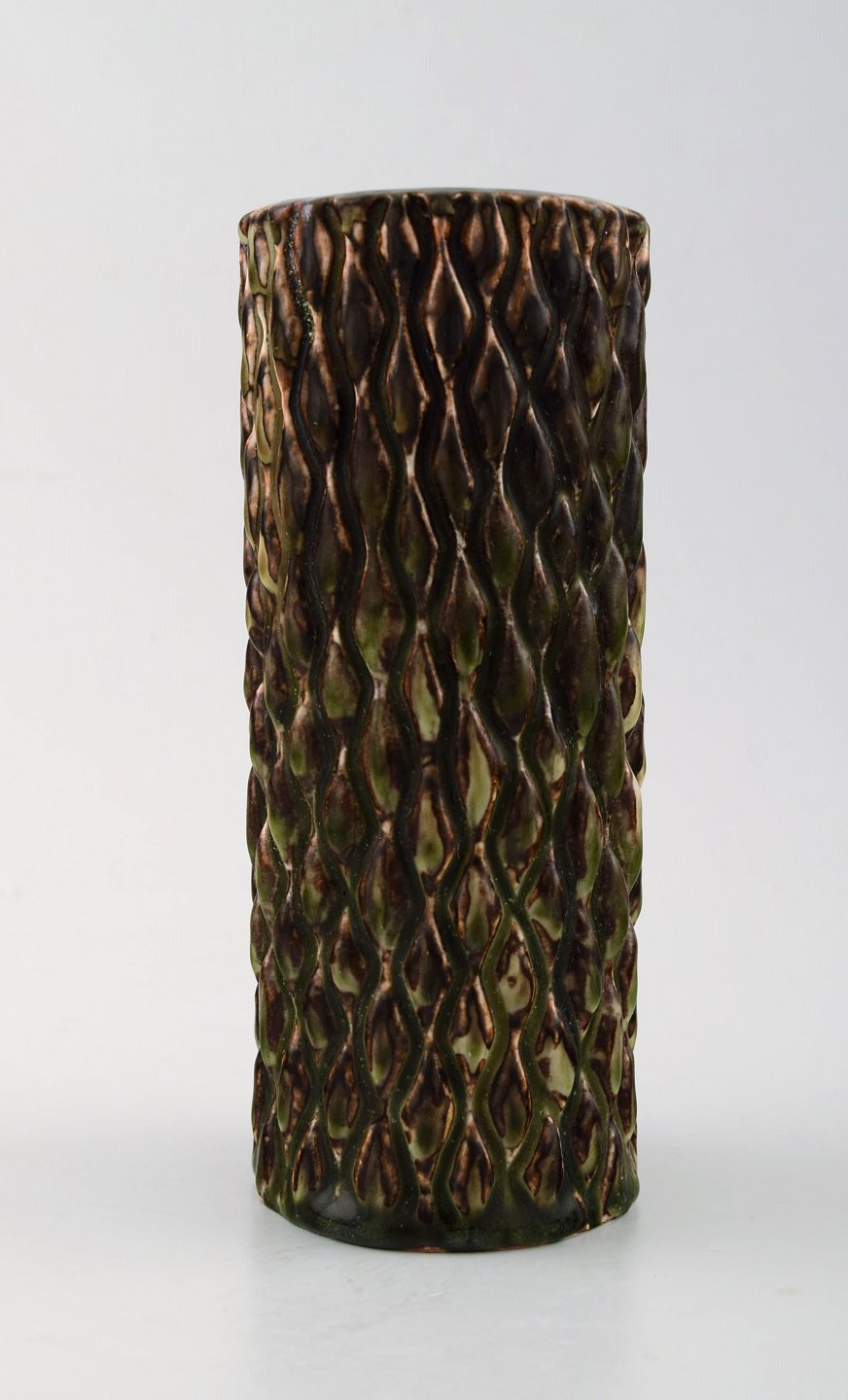 Vase af stentøj modelleret i spirende stil, dekoreret med grønlig sung glasur. Usædvanlig smuk glasur.