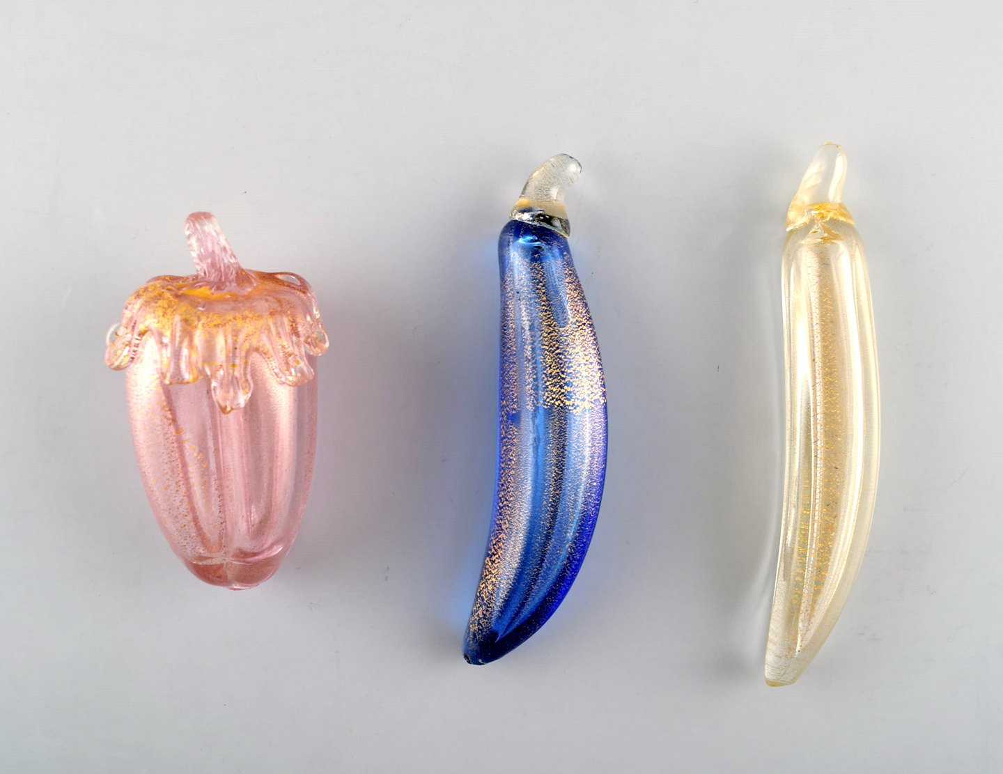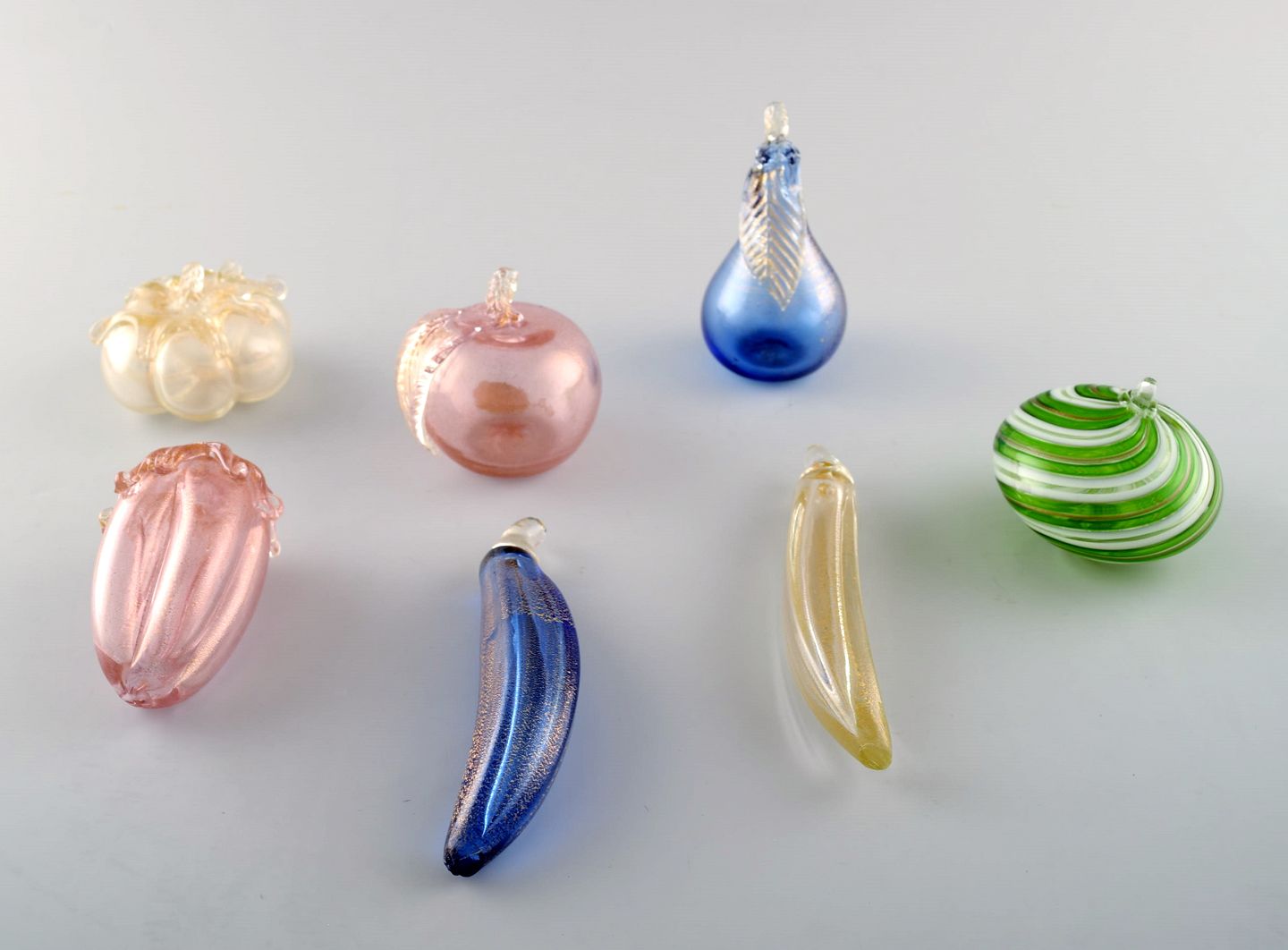 Large collection of Murano fruits in art glass, 1960 s. A total of seven fruits. Murano sticker. In perfect condition. Measures: Largest 14 cm. long.