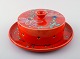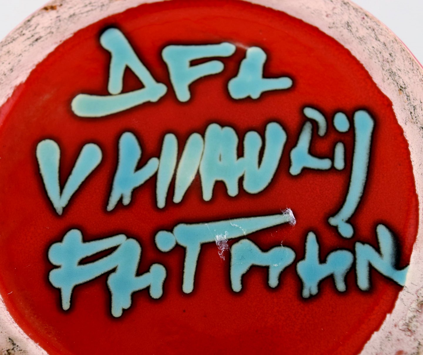 Vallauris, Frankrig. Vodka/Lemonade/Sangria-sæt til fire. Håndmalet, unika. Karaffel, 4 bægre samt osteklokke. Signeret : Midt 1900-tallet. Måler karaffel: 21 cm. x 16 cm.