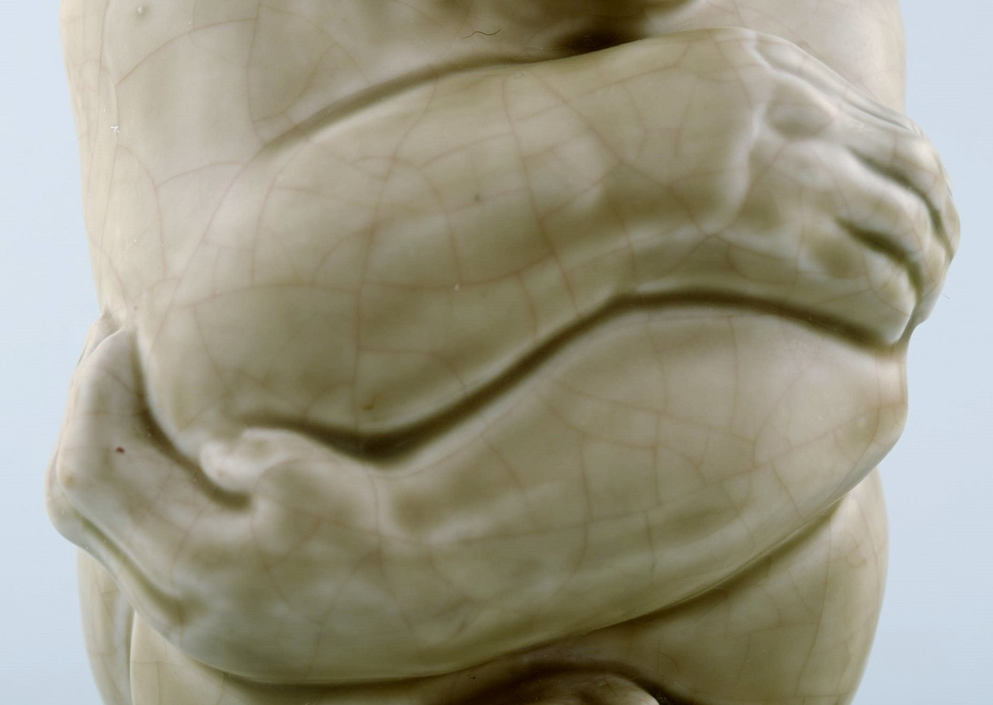 Sjælden Knud Kyhn for Aluminia/Royal Copenhagen, stentøjsfigur, abe. Lys krakkeleret glasur. 1. sortering. Perfekt stand. 1920/30´erne. Måler 14 cm. x 7,5 cm. Stemplet : Kyhn på siden samt Aluminia 57102.