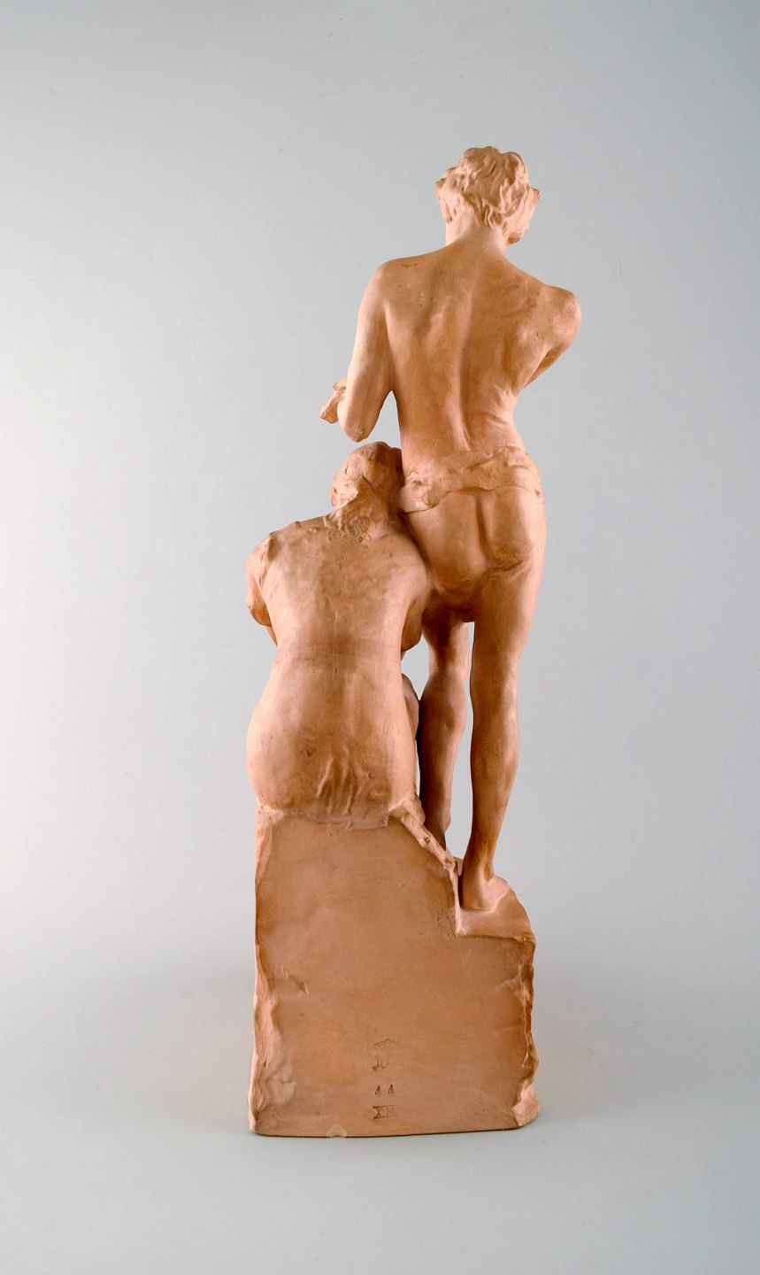 Ipsens enke, , uglaseret lertøj/terracotta. Stemplet P. Ipsen, no. 44. Ungt par. Måler : 37 x 16 cm. 1890´erne. I perfekt stand.