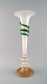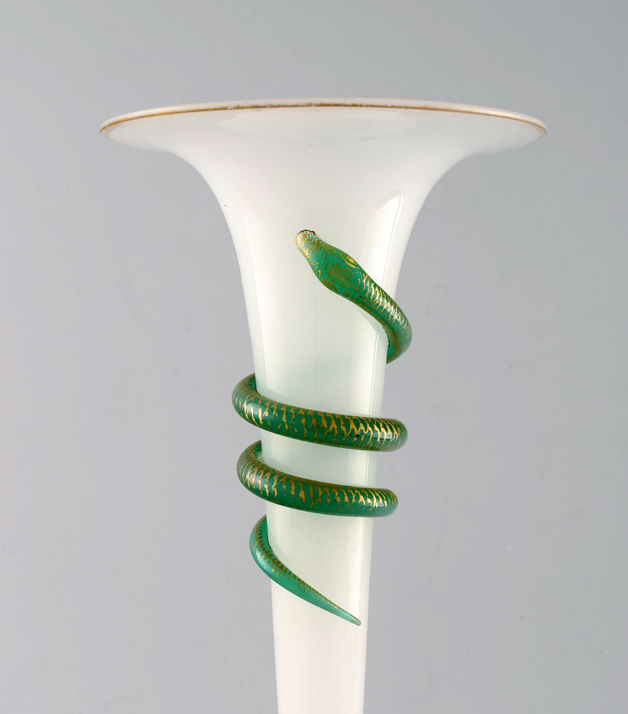 Stor Art Nouveau opaline glasvase med grøn slange. I flot stand. Måler : 39 cm. x 15 cm.