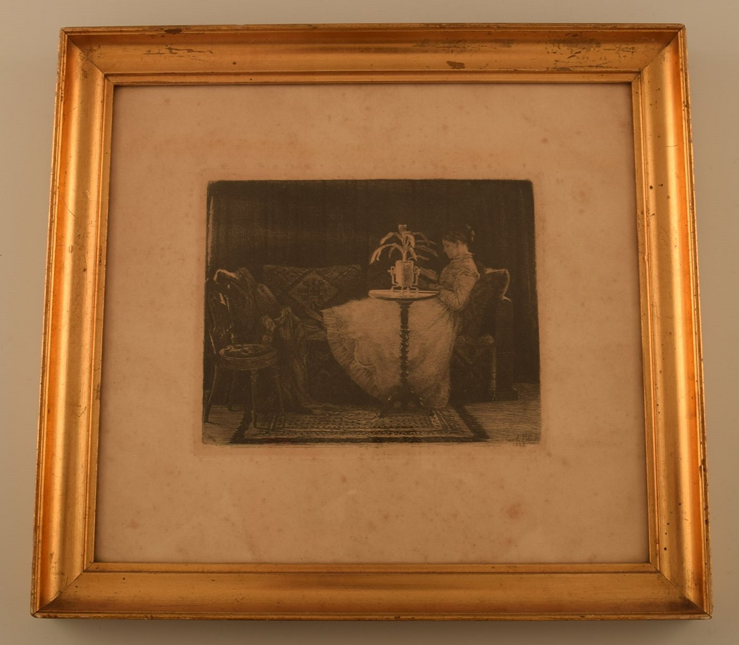 Carl Bloch. "Læsende dame". Radering. Signeret i trykket : Carl Bloch samt dateret 1882. Indrammet mål: 26 x 29 cm. Lysmål 12 cm. x 15 cm. I god stand.