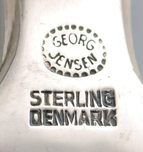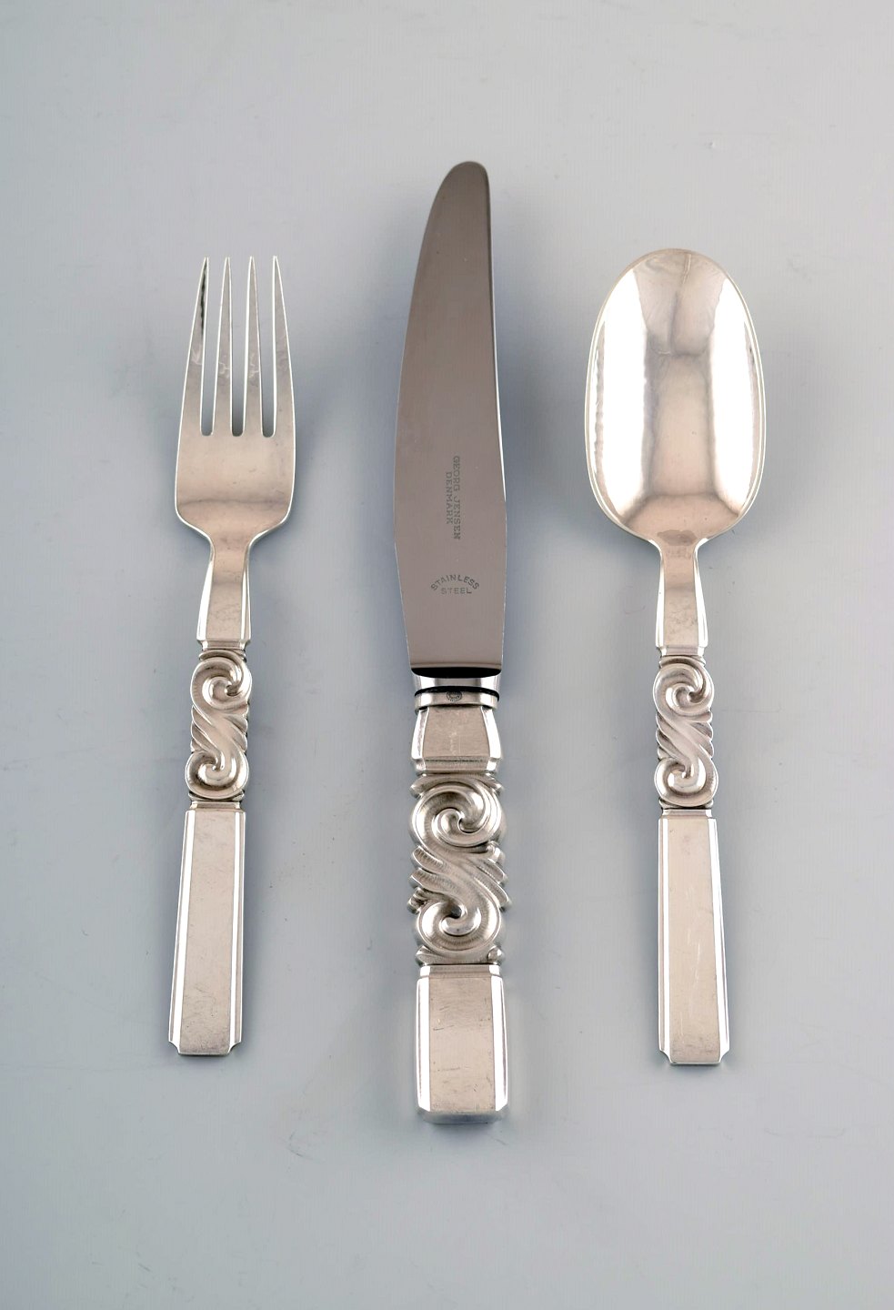 Georg Jensen. Bestik, Saga nr. 22, komplet middagsservice af hammerslået Sterlingsølv bestående af: 6 middagsknive, 6 middagsgafler, 6 spiseskeer. I perfekt stand. Stemplet. Kniv måler : 22,5 cm.