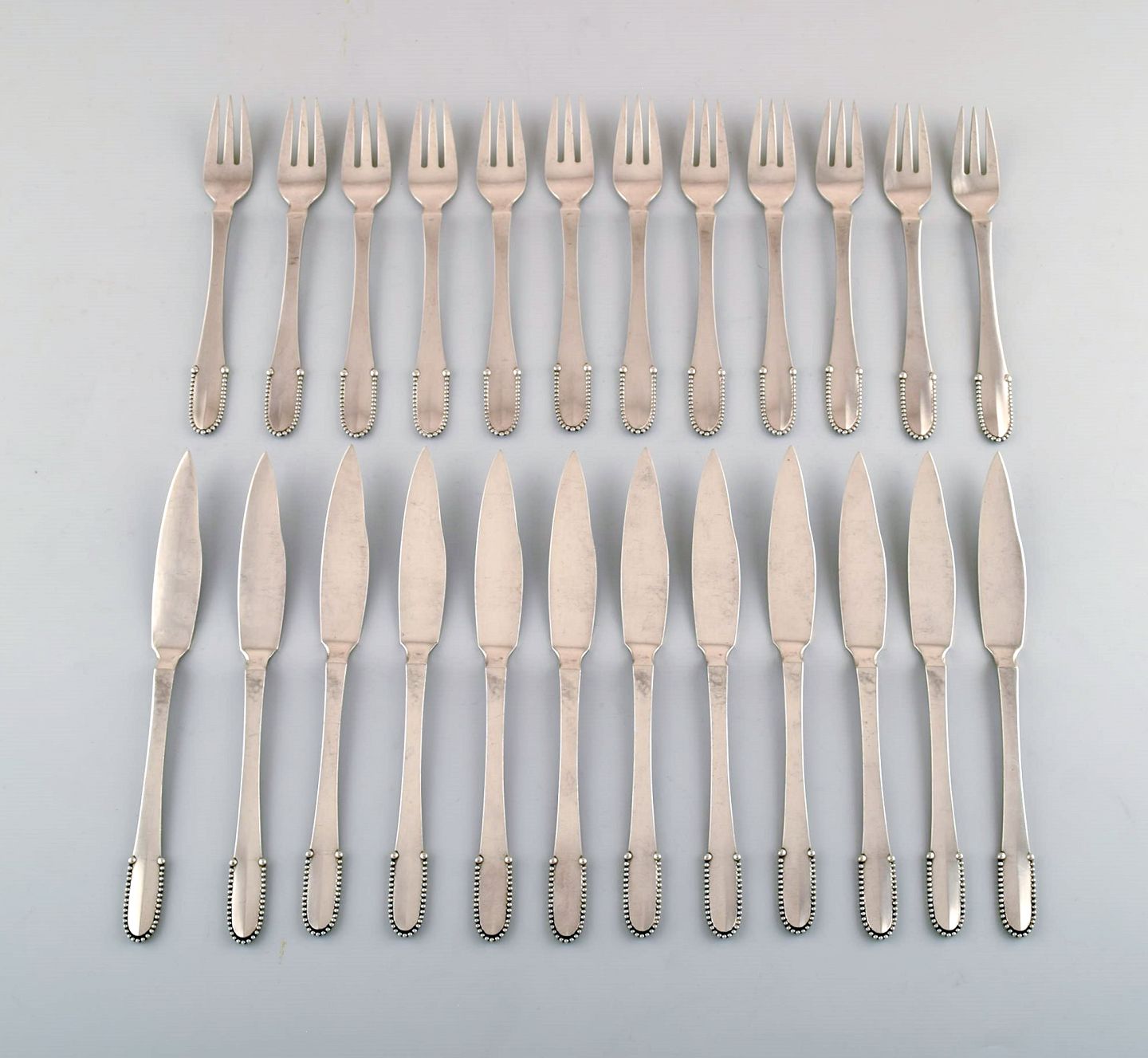 12 fiskeknive, 12 fiskegafler.