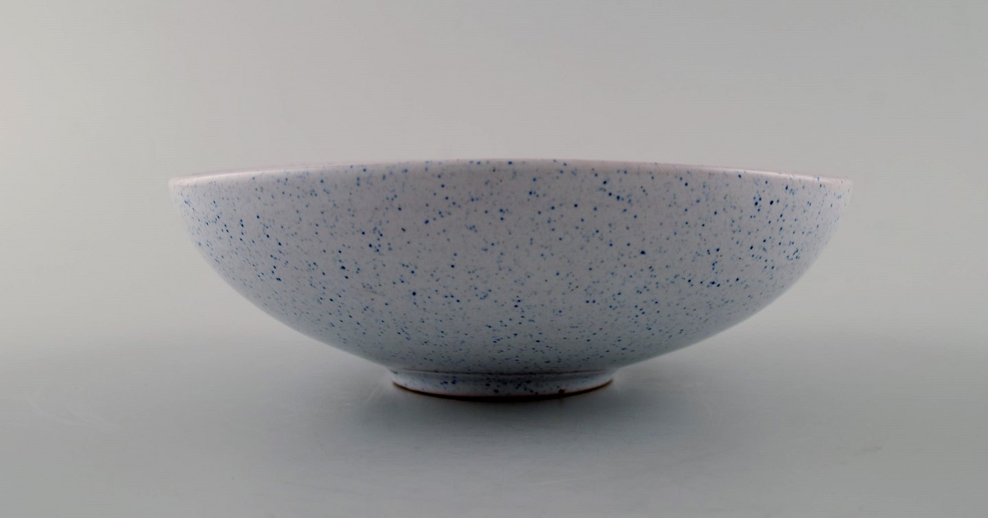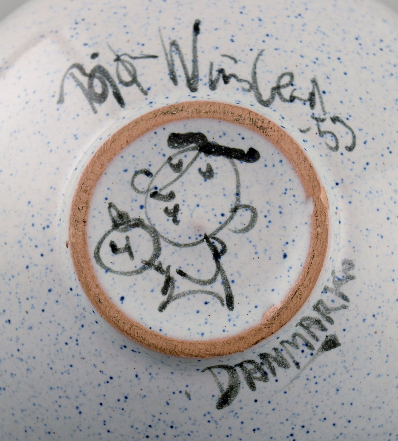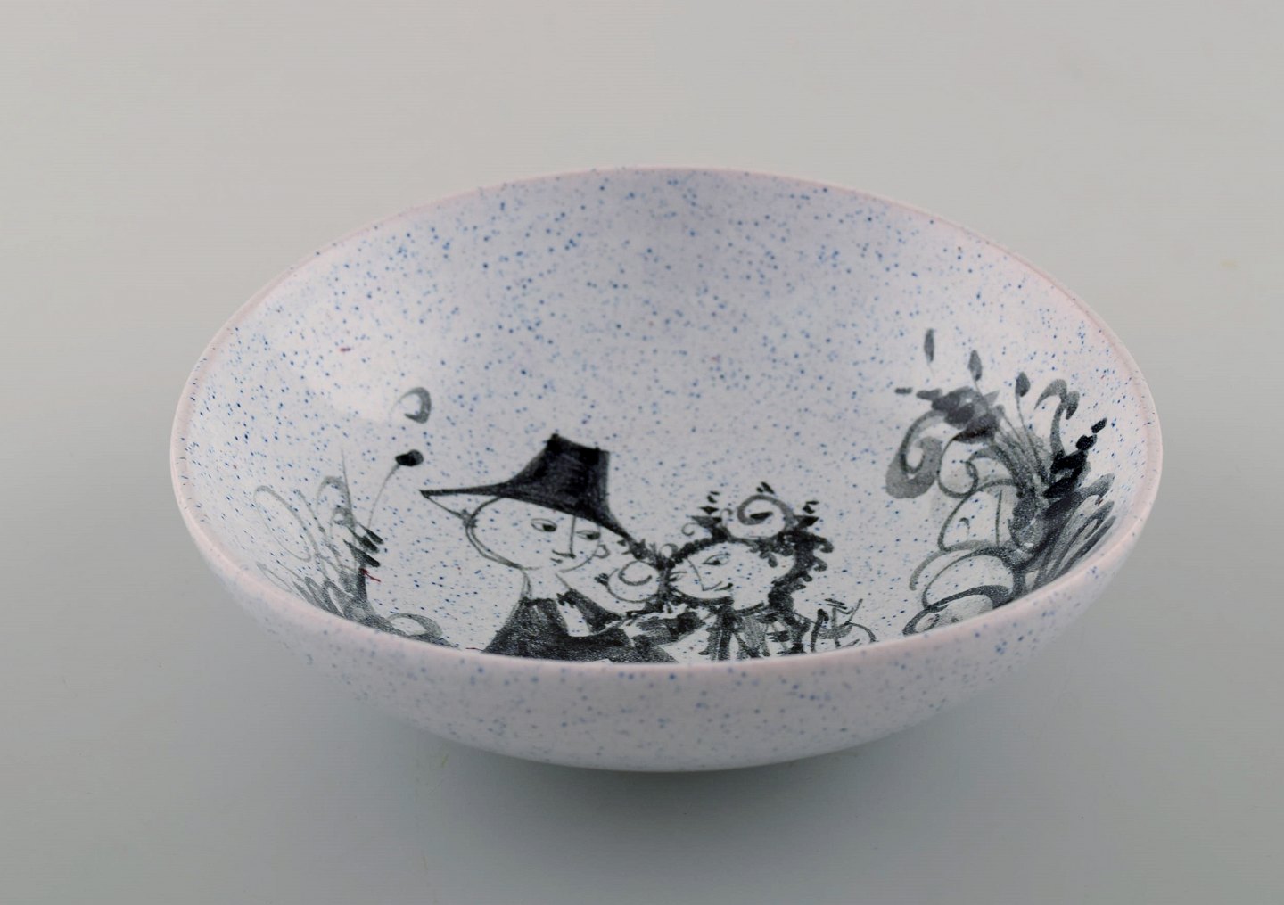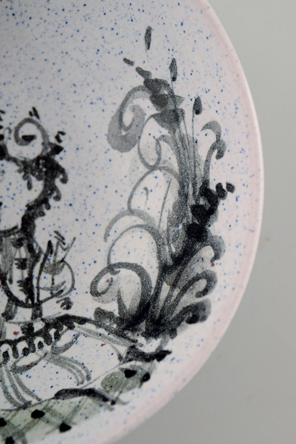 Bjørn Wiinblad, eget værksted: Sjælden og tidlig unika rund skål dekoreret med romantisk par i haven, Bjørn Wiinblad 53. Diameter : 13 cm. x 4,5 cm. højt. I perfekt stand. Signeret 1953.