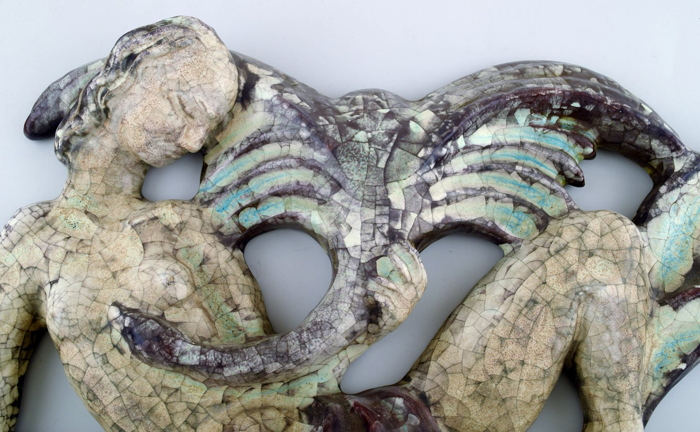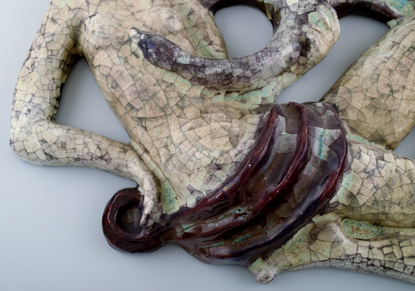 Michael Andersen keramik, Bornholm. Relief. Leda og svanen. Måler : 48 x 37 cm. Modelnummer 4850. Perfekt stand. Stemplet.