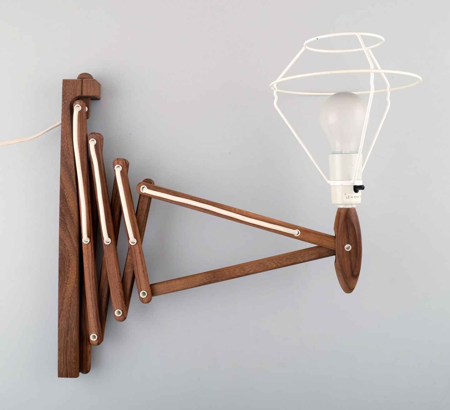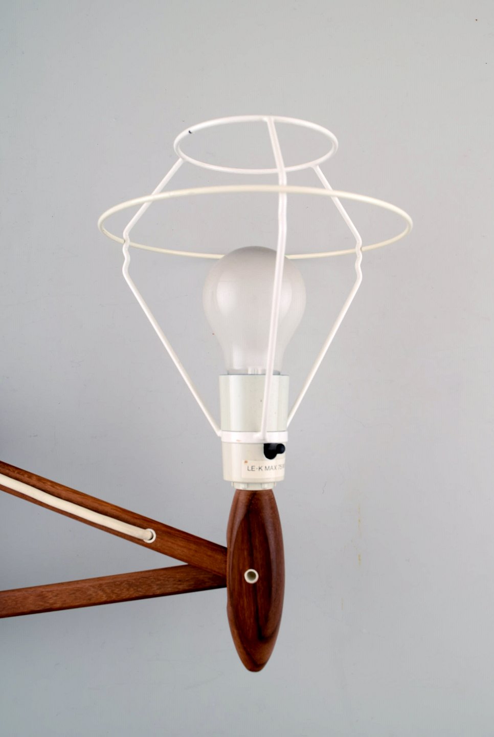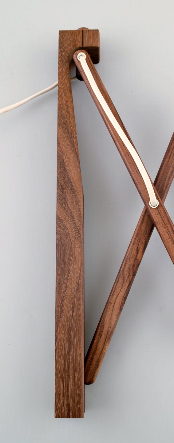 Le Klint / Erik Hansen: Opadvendt sakselampe af teak. Højde 38 cm. Total længde 100 cm. I flot stand. Etiket fra Le Klint.