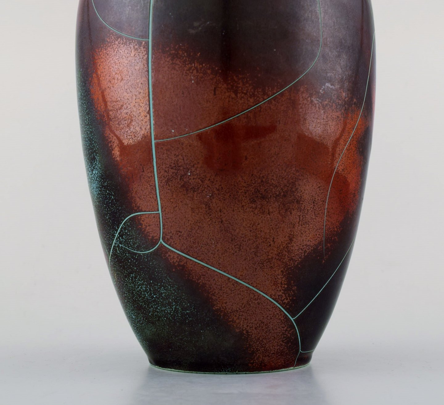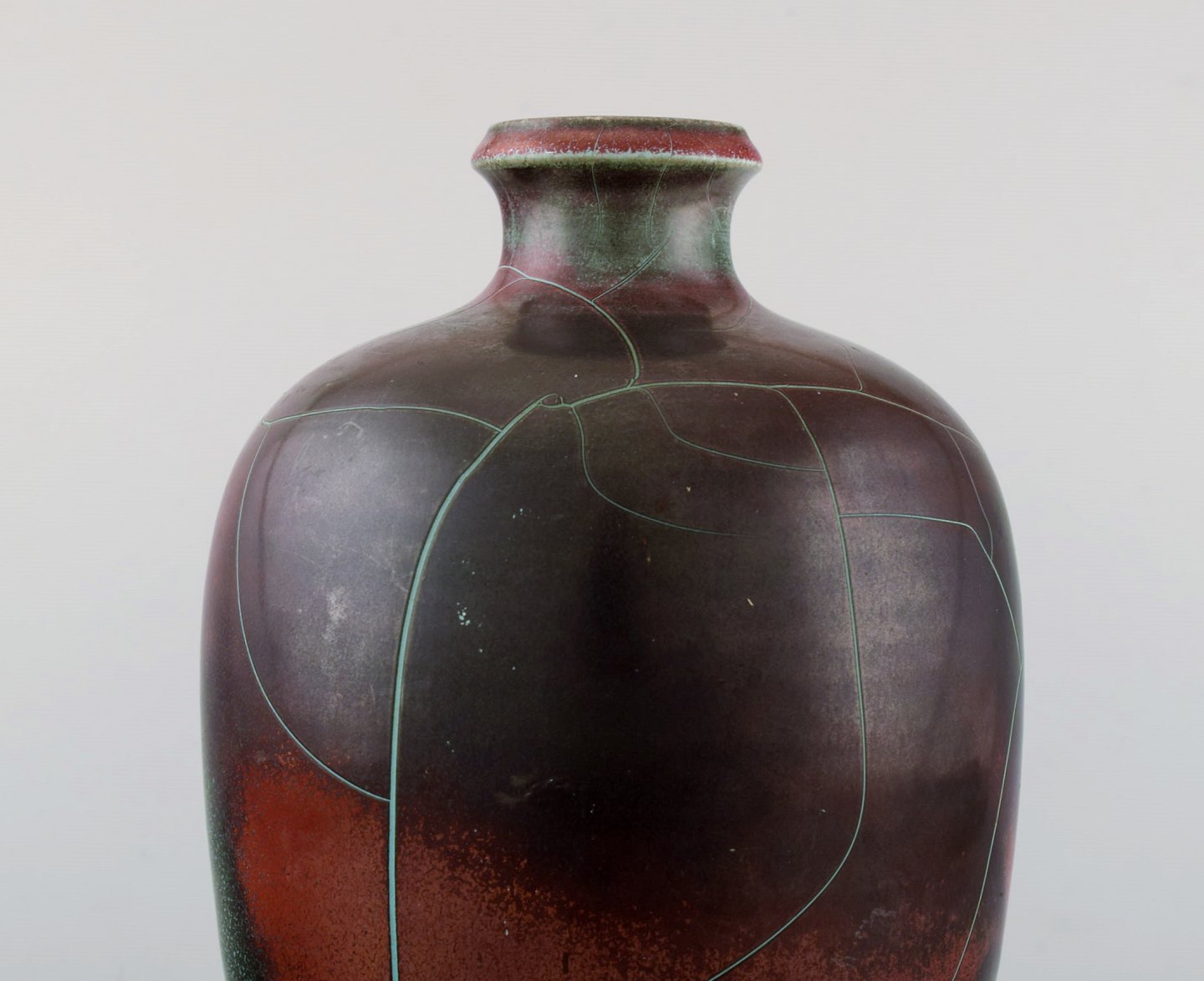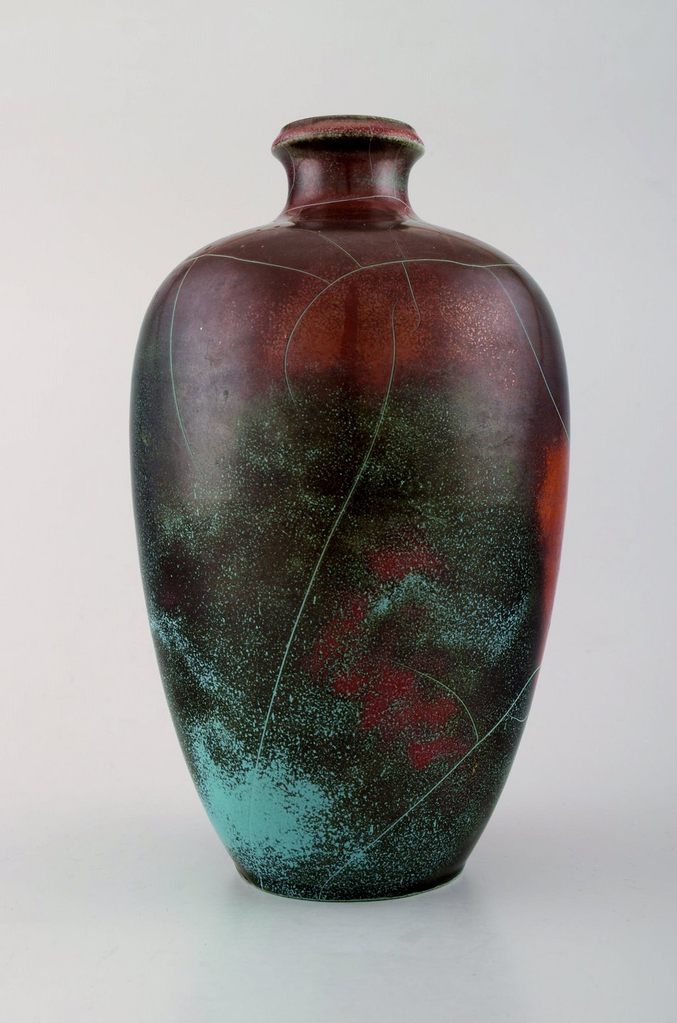 Richard Uhlemeyer, tysk keramiker. Keramikvase, smuk krakeleret glasur i grøn røde nuancer. Tyskland, 1950´erne. Måler 26,5 cm. x 16 cm. I perfekt stand. Stemplet.