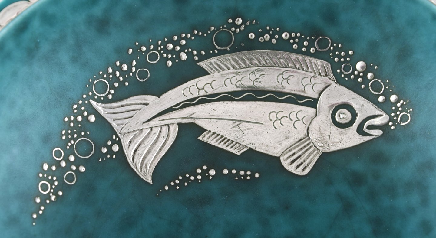 Wilhelm Kåge, Gustavsberg, Argenta Art deco skål dekoreret med fisk.