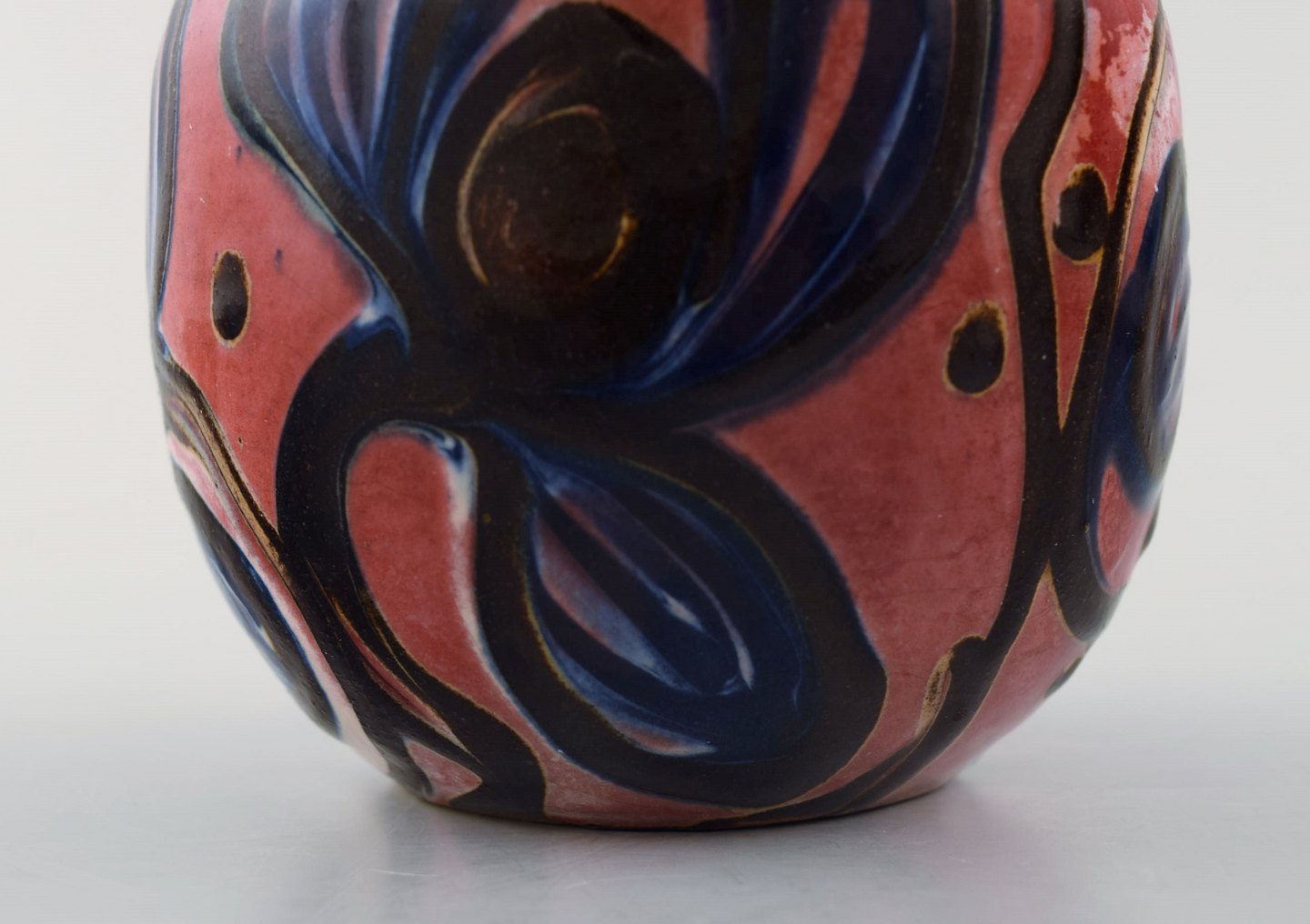 Fin Kähler, HAK, glaseret stentøjsvase. 1940´erne. Blå blomster på rosa bund.