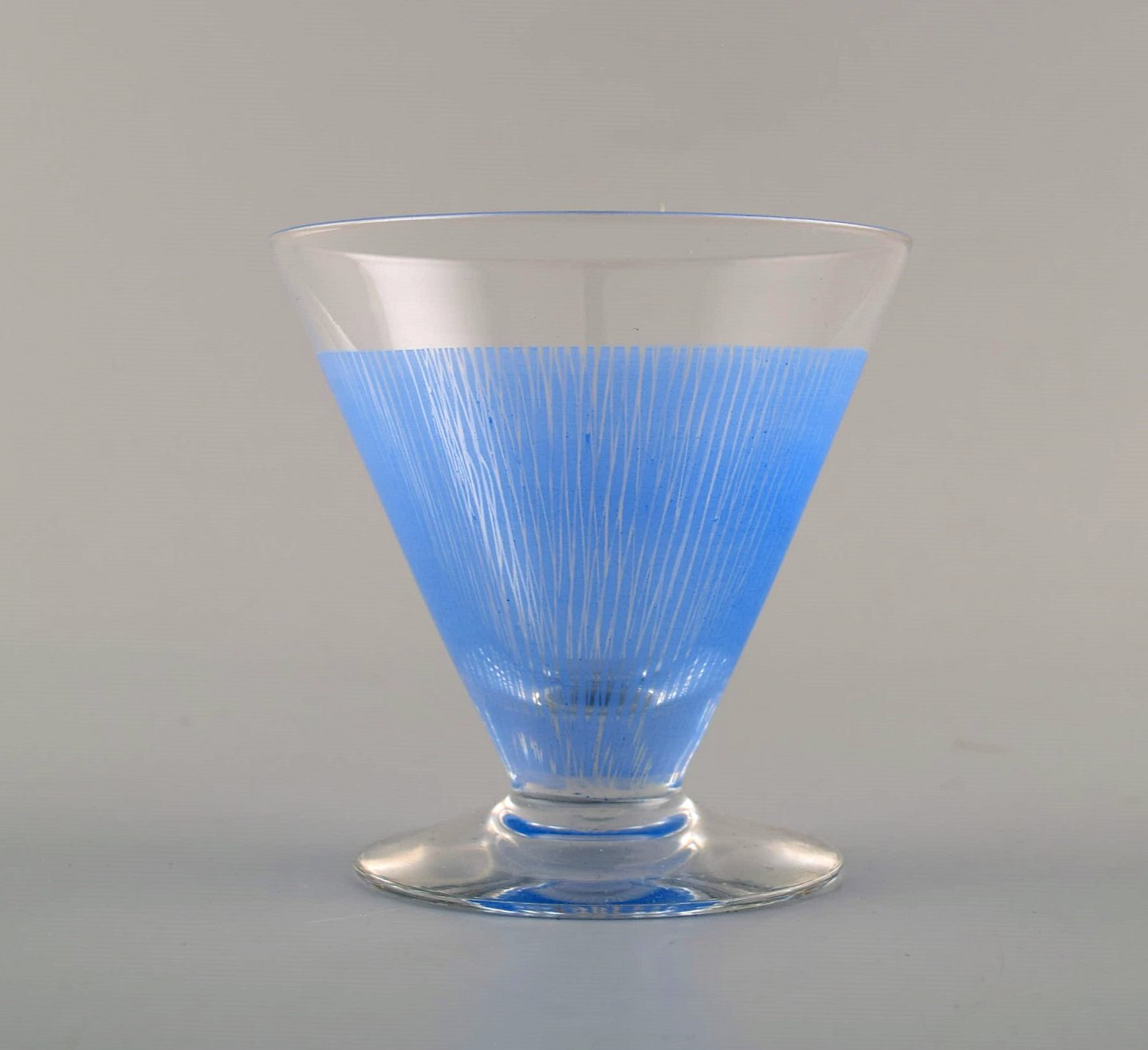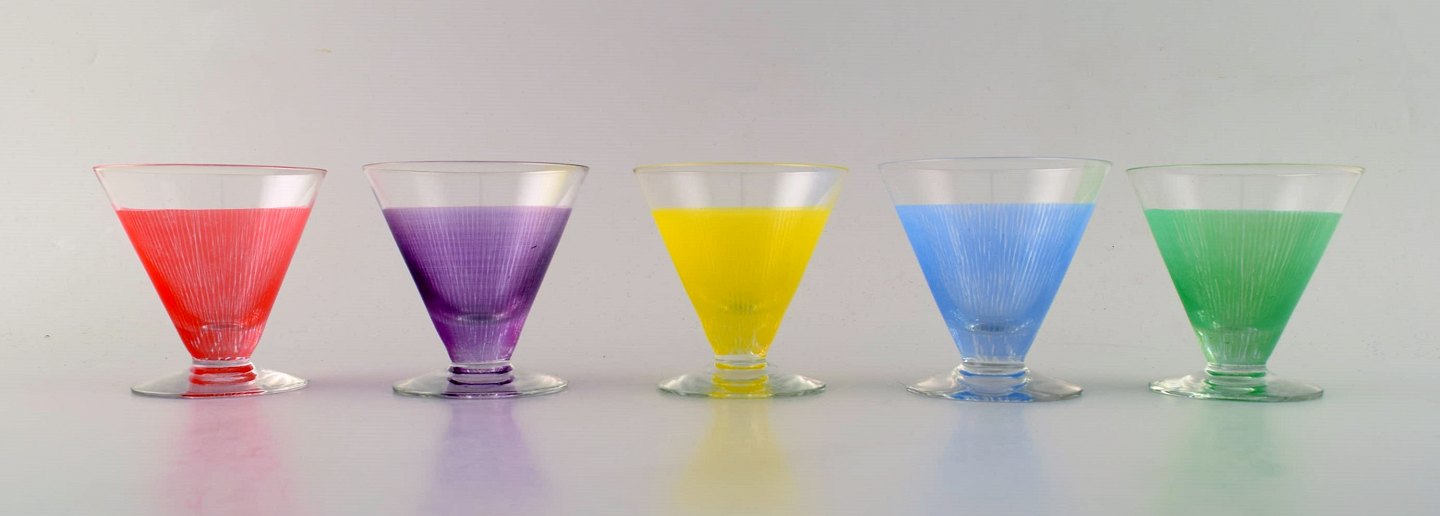 8 farverige cocktailglas med karaffel. "Party", Bengt Orup, Johansfors. Designet i 1953. Svensk design.