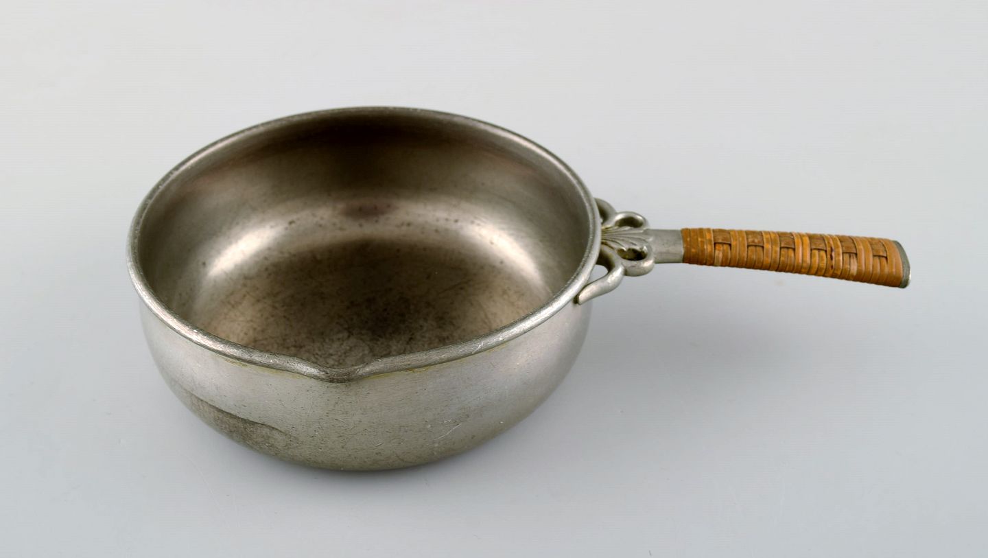 Just Andersen sjælden art deco kasserolle i tin med flethank. 1930´erne.