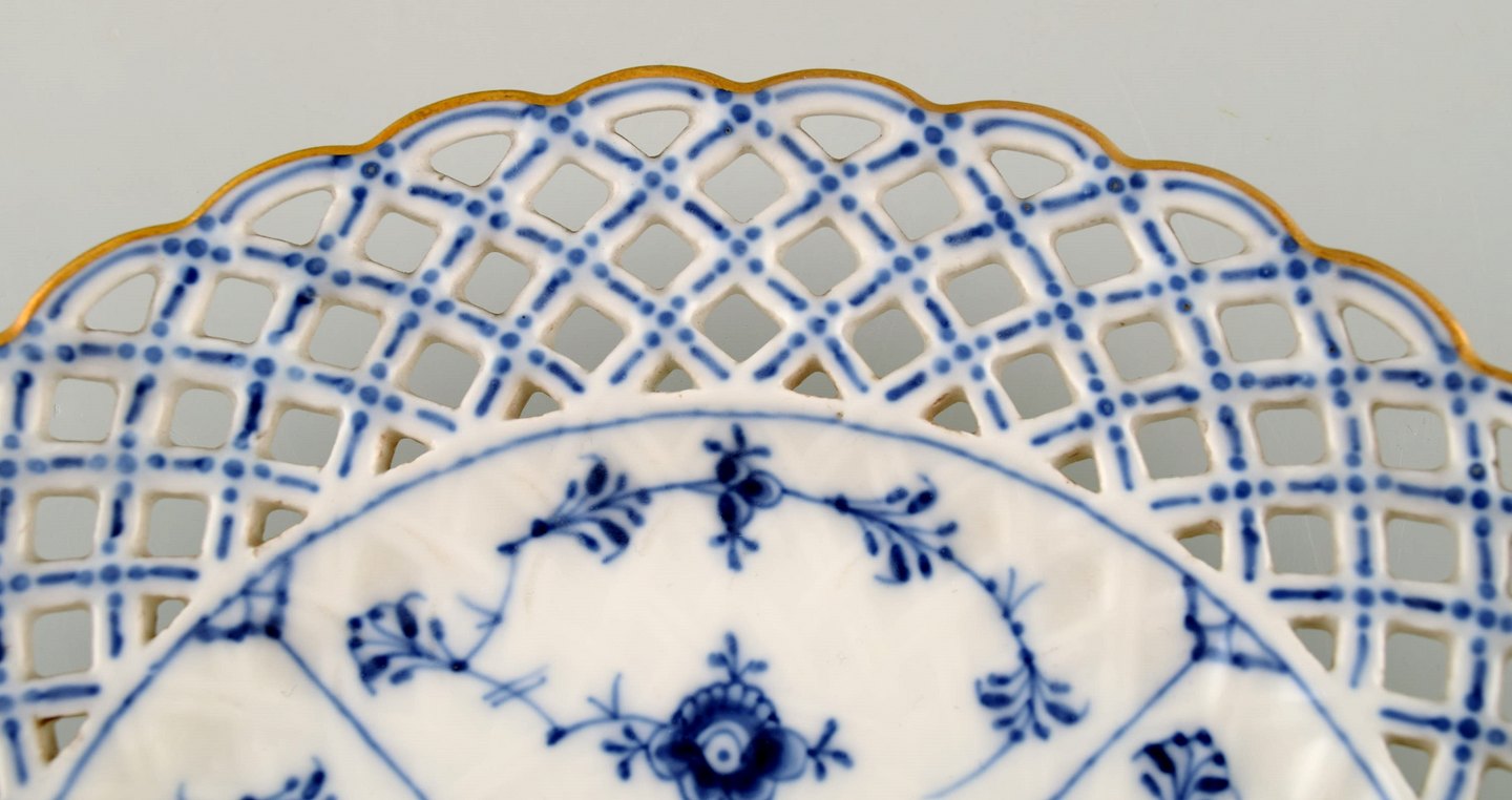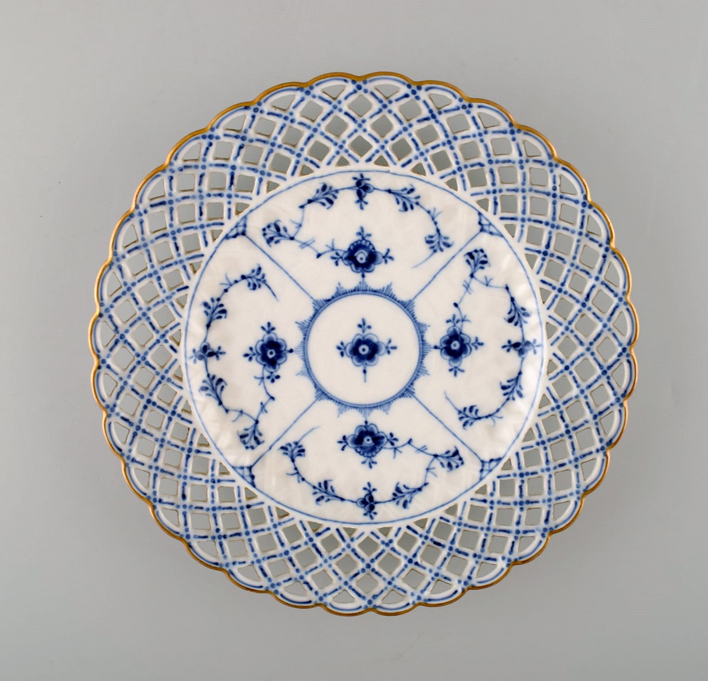 Et sæt på 4 antikke Royal Copenhagen musselmalet helblonde tallerkener med guldkant. Nummer: 1/1135. 1. sortering, i perfekt stand. Måler: 21 cm. i diameter. Tidligt stempel, 1894-1900.