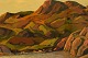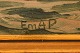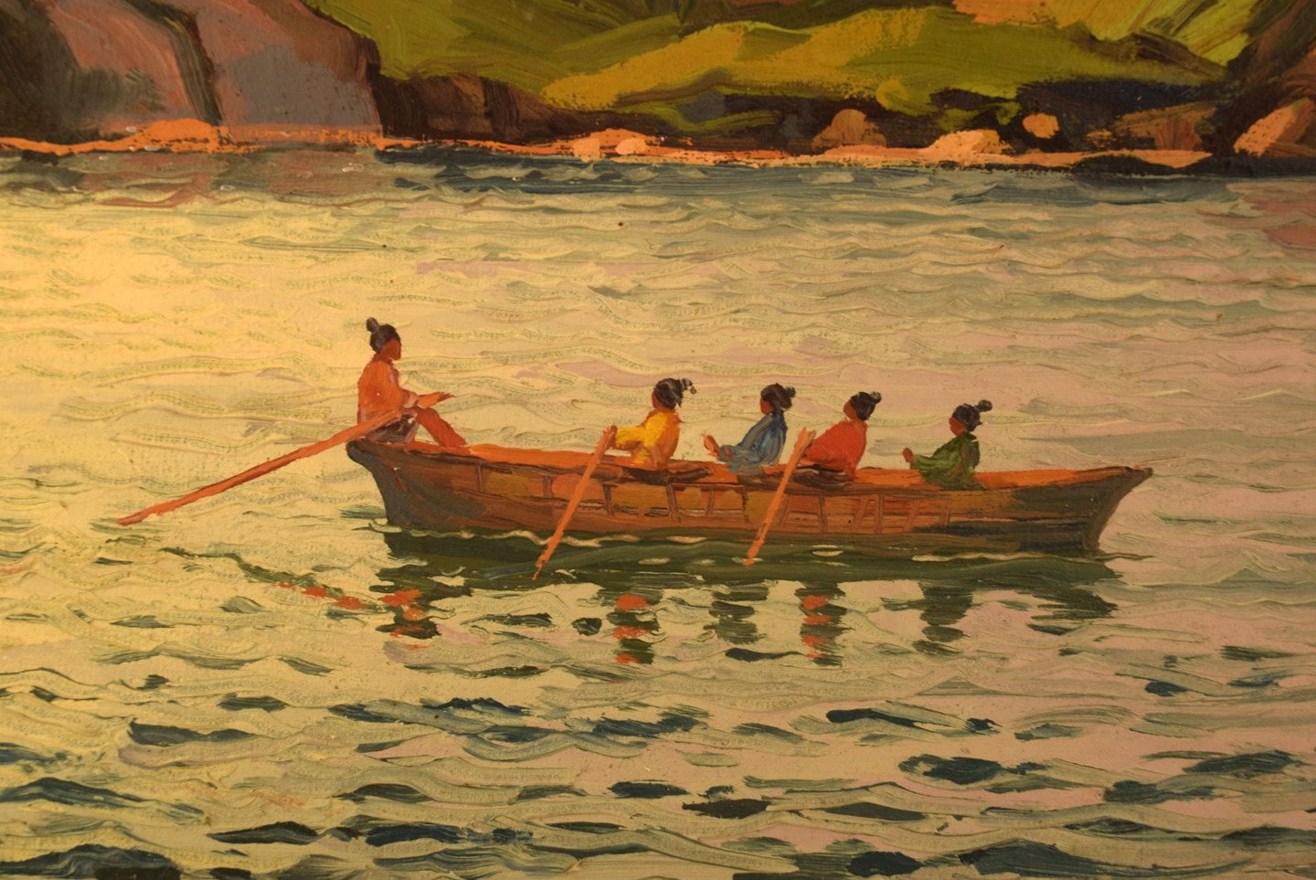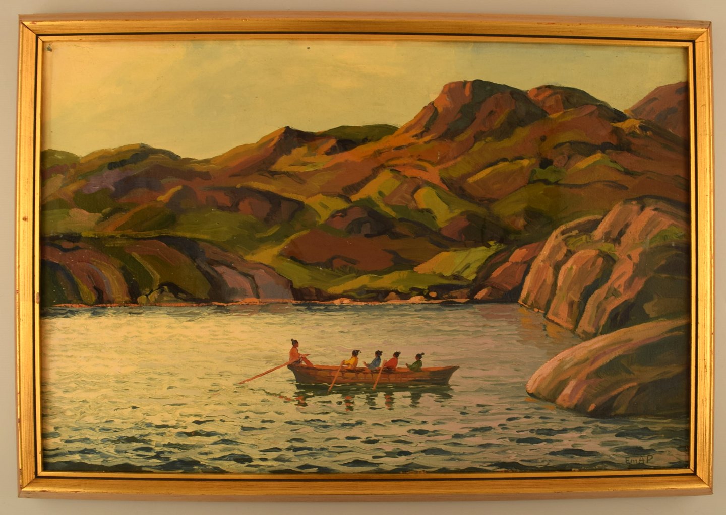 Emanuel A. Petersen (b. 1894, d. 1948). Umiak (women's boat) in Greenlandic fjord. Oil on canvas.