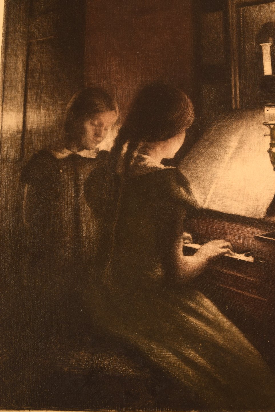 Peter Ilsted: Interiør med to piger ved klaveret. Signeret Peter Ilsted. Farvemezzotinte. Pladestørrelse 23,5 cm. x 21,5 cm. I god stand.