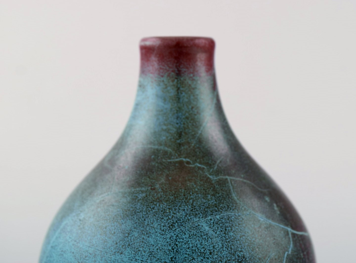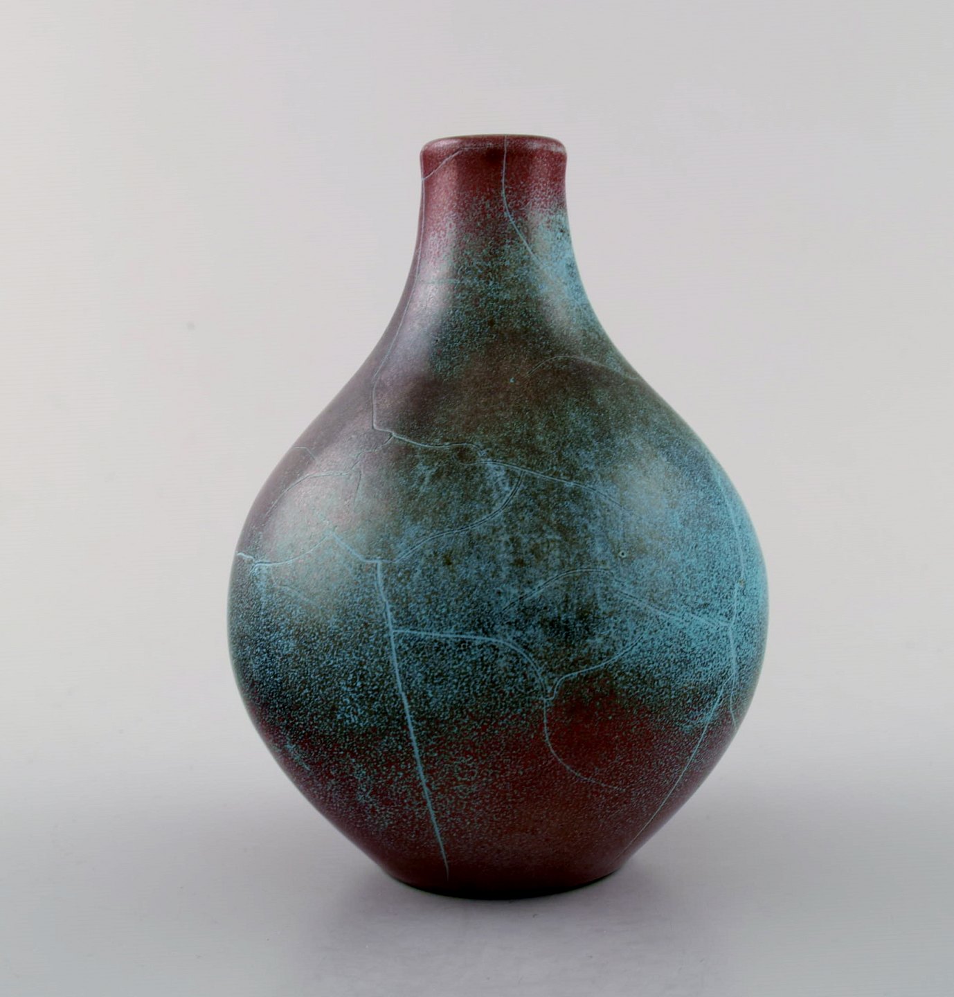 Richard Uhlemeyer, tysk keramiker. Keramikvase, smuk krakeleret glasur i rød grønne nuancer. Tyskland, 1940/50´erne. Måler 13 cm. x 11 cm. I perfekt stand. Stemplet.