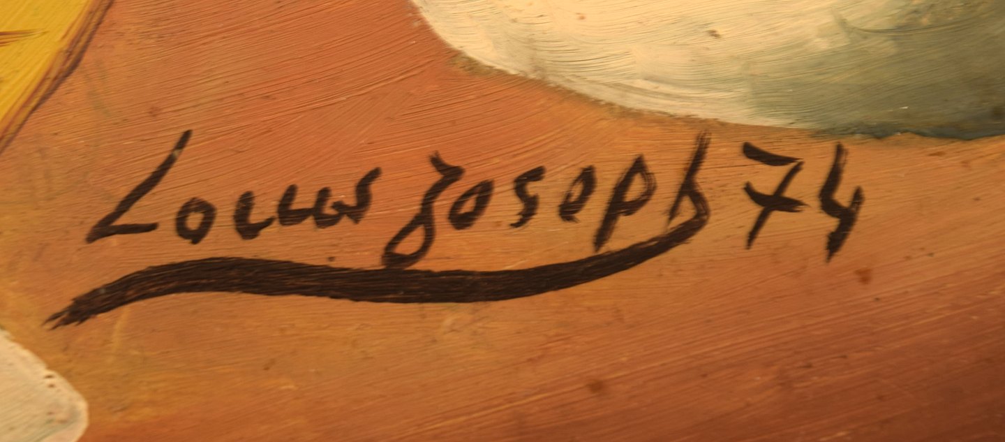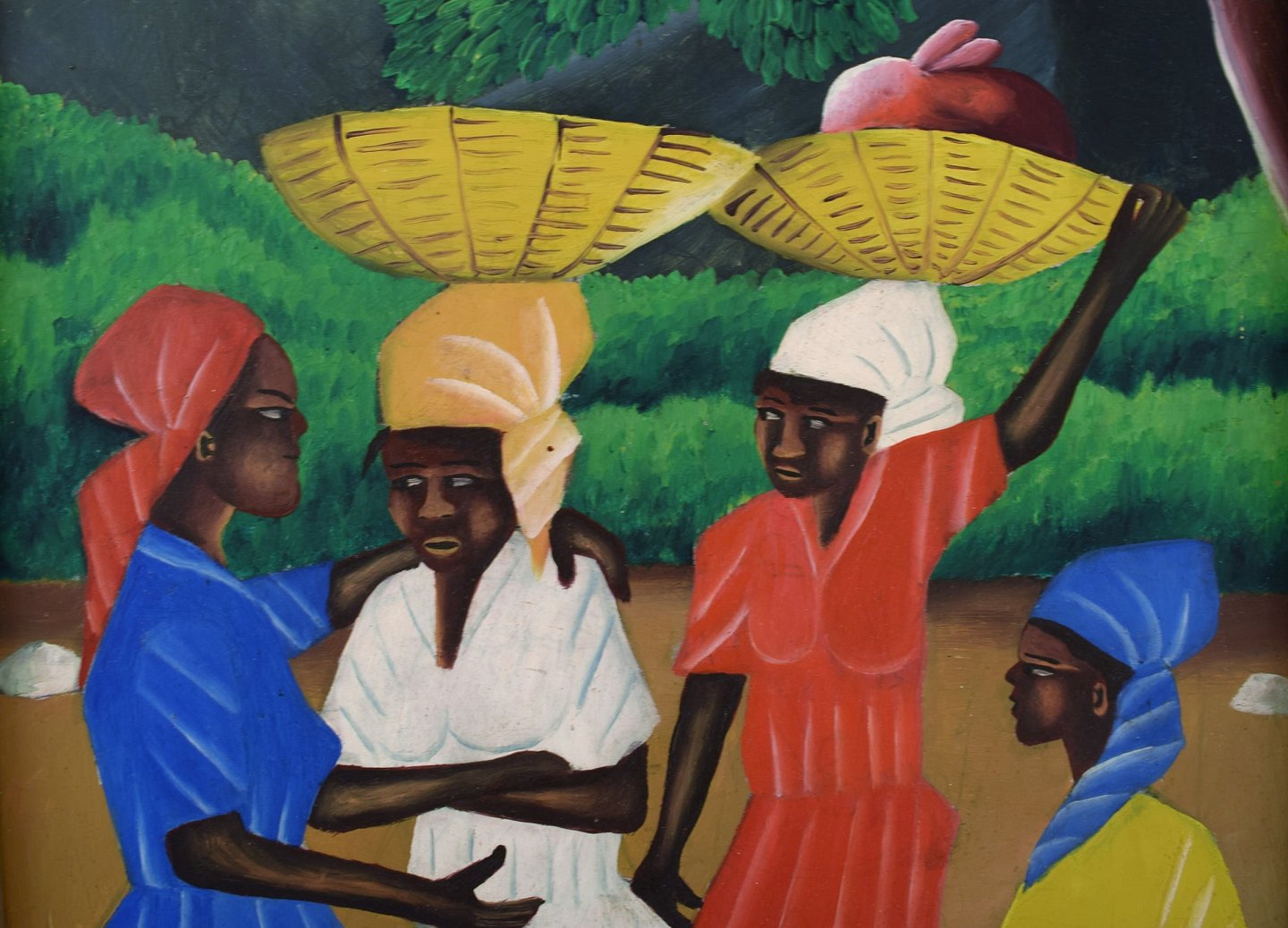 Loccas Joseph, haitiansk kunstner. Naivistisk skole. Olie på plade. 1974. Landsbykvinder bærende på frugter. Signeret. I flot stand. Lærredet måler: 59 x 29 cm. Rammen måler: 2 cm.