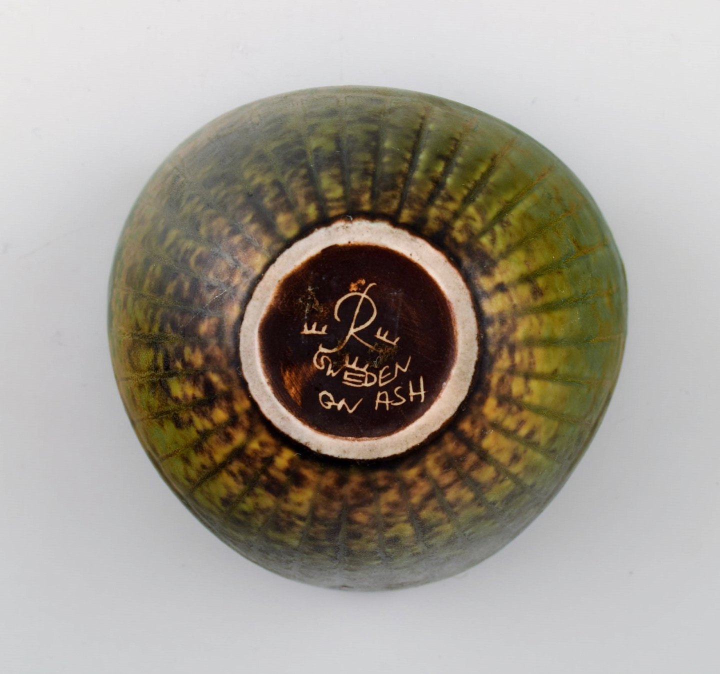 Rørstrand/Rörstrand stentøjsskål af Gunnar Nylund. Måler: 8,5 x 5 cm. I perfekt stand. Flot glasur i sorte og grønne nuancer. 1. sortering. Stemplet.