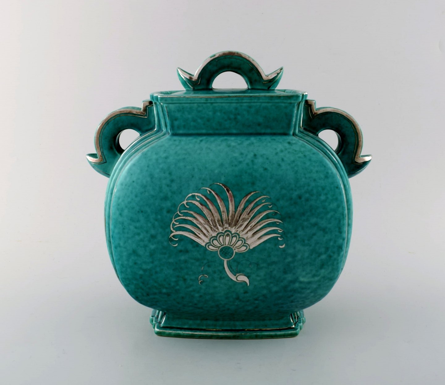Wilhelm Kåge, Gustavsberg, stor Argenta art deco lågkrukke i keramik dekoreret med sølvindlæg. Sverige 1940´erne. Måler 25 x 25 cm. Stemplet Gustavsberg, Kåge. I perfekt stand.