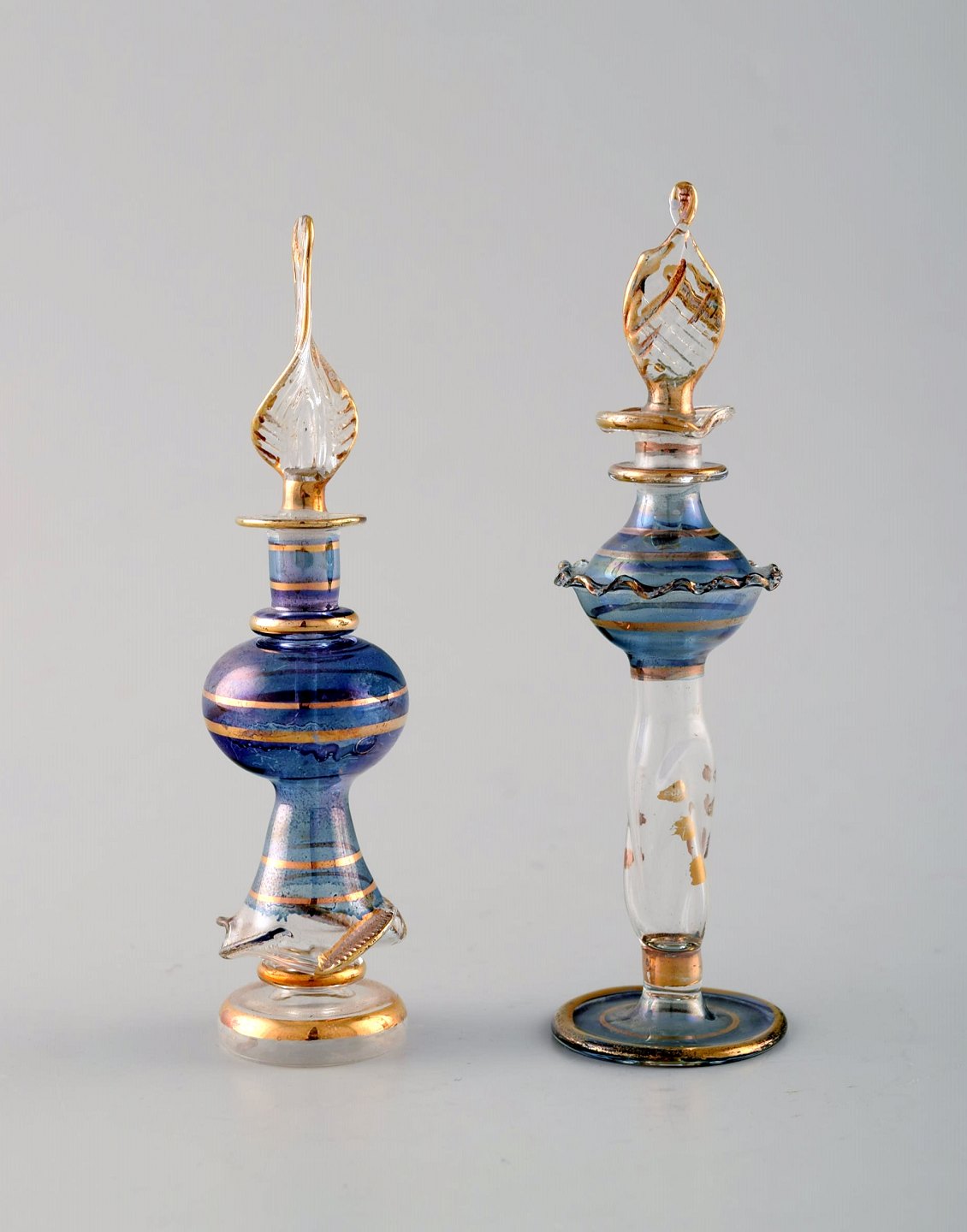 Stor samling af italienske flakoner i mundblæst kunstglas. Delvist farvet glas dekoreret med bladguld. 1930/40'erne.