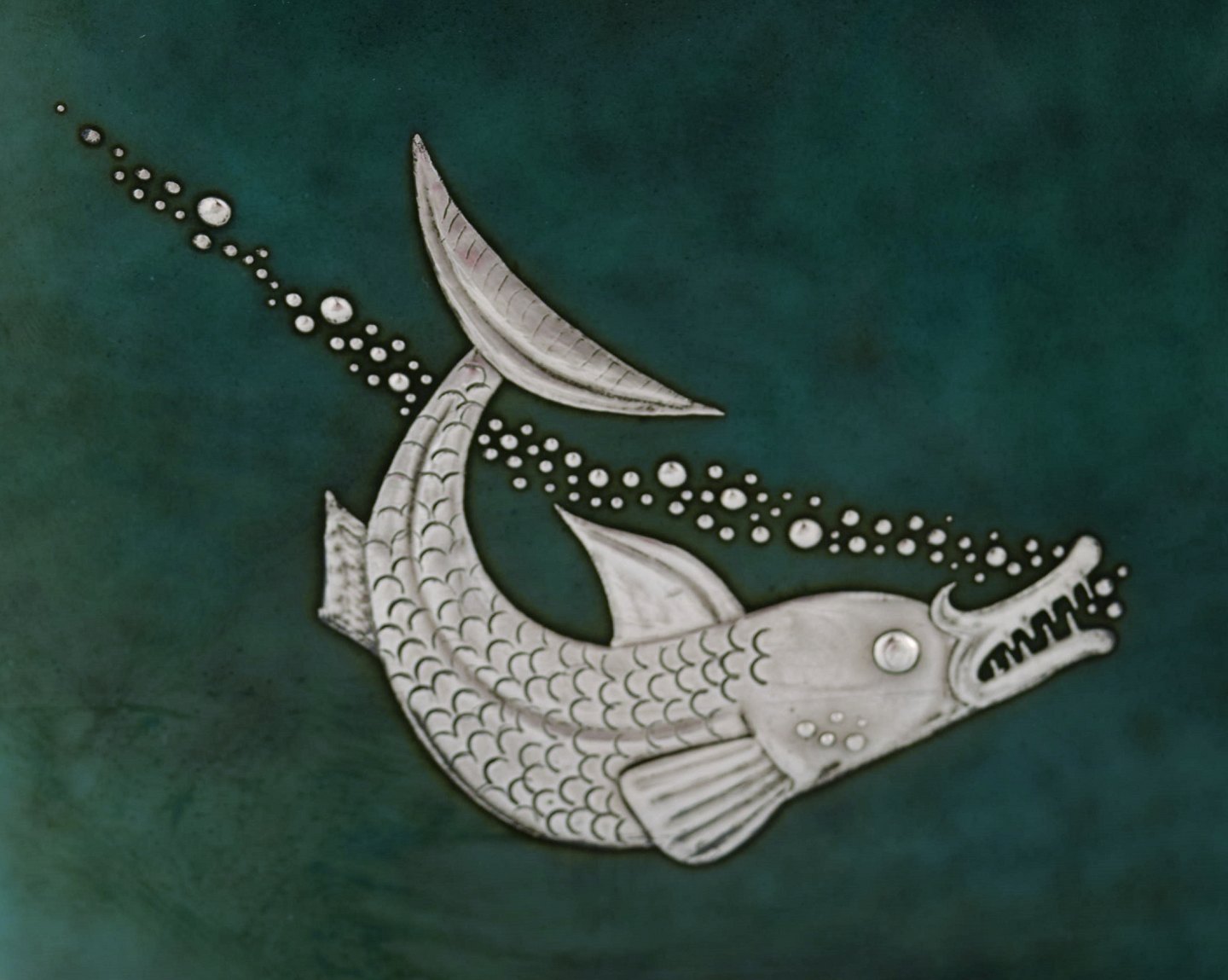 Wilhelm Kåge, Gustavsberg, art deco lågkrukke med sølvindlæg. Sverige 1940´erne. Måler: 21 x 15 cm. Stemplet Gustavsberg, Kåge. Modelnummer: 1236. I perfekt stand.