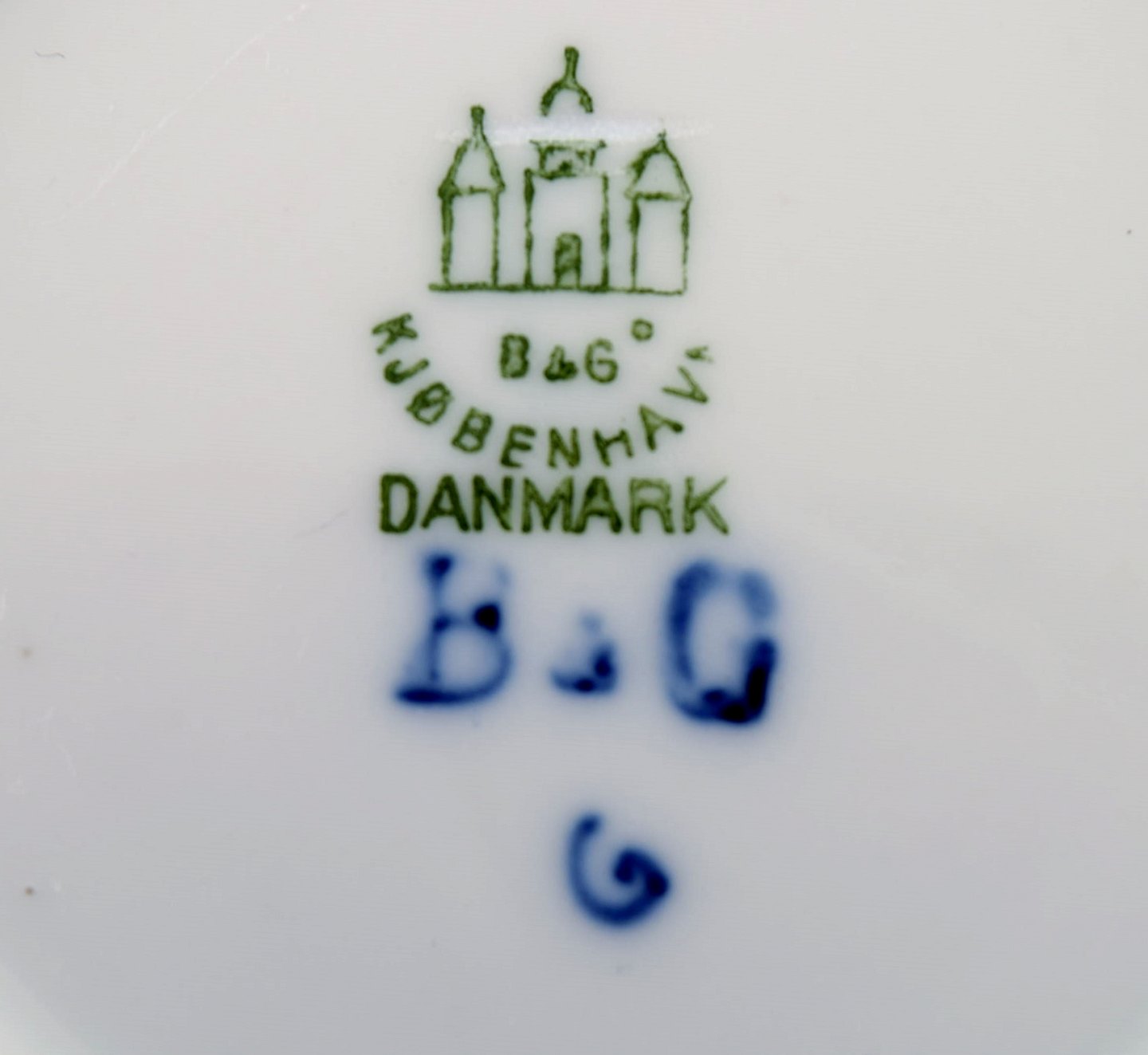 Bing & Grøndahl / B&G, Musselmalet. Sæt på 4 mokkakopper med underkopper. Kop måler: 6,5 x 5,5 cm. Underkop måler: 11,5 cm. I perfekt stand. 2. sortering. Stemplet.