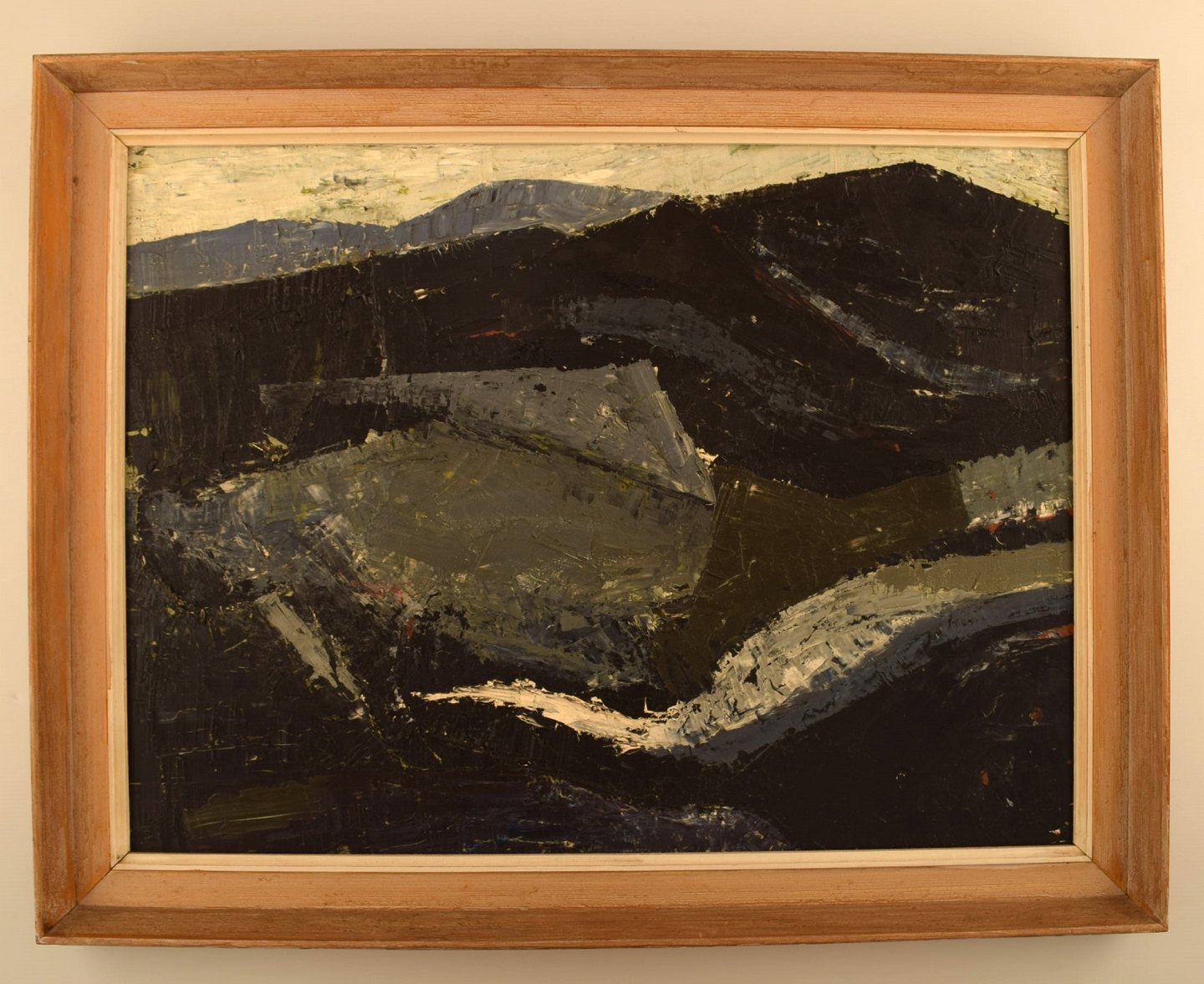 Frank Hammershøj (f. 1940, d. 2013). Olie på plade. 1960'erne. Modernistisk landskab med bjerge. I flot stand. Pladen måler: 54 x 40 cm. Rammen måler: 4,5 cm.