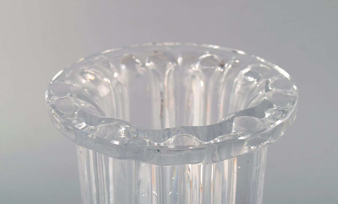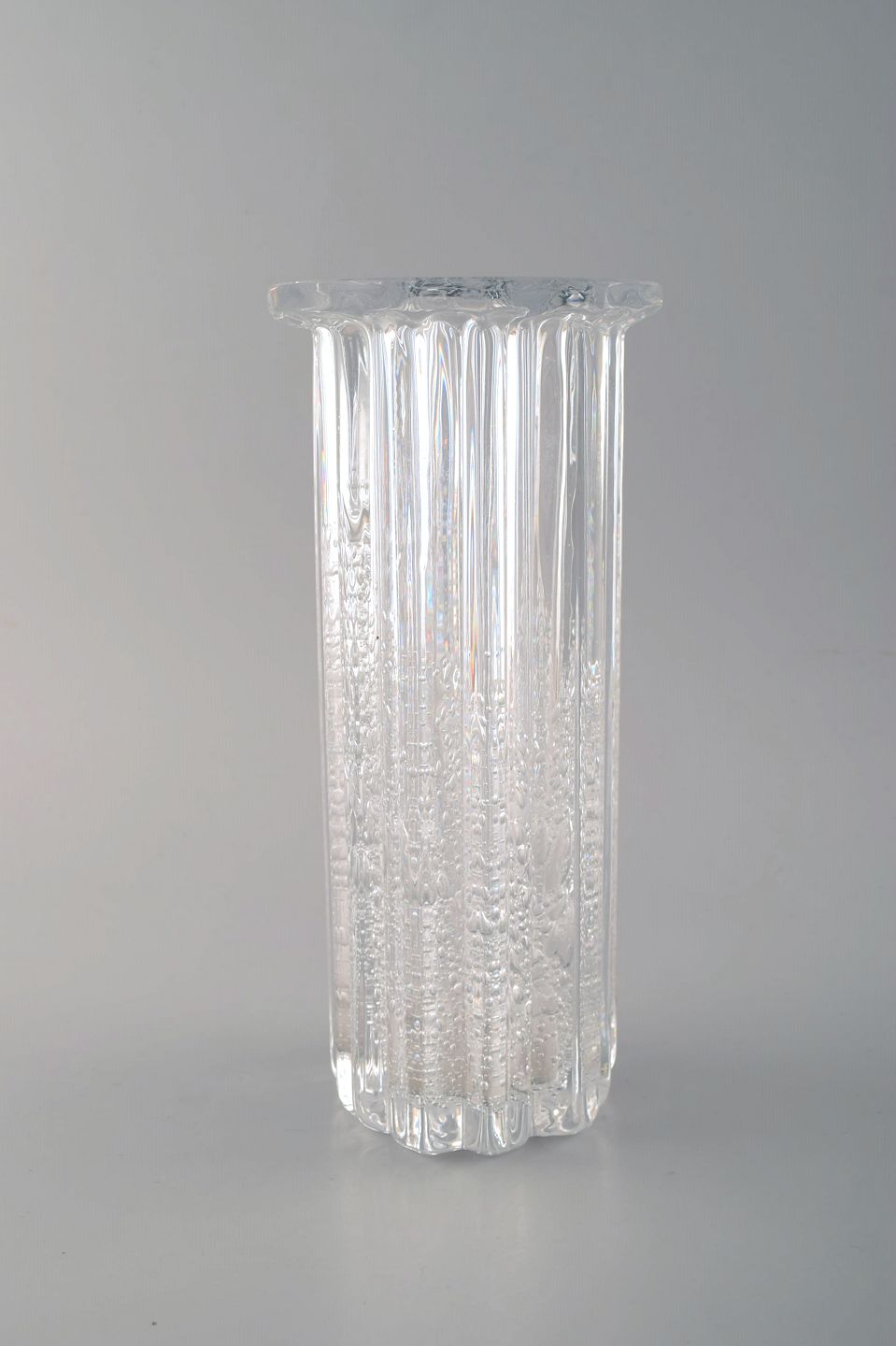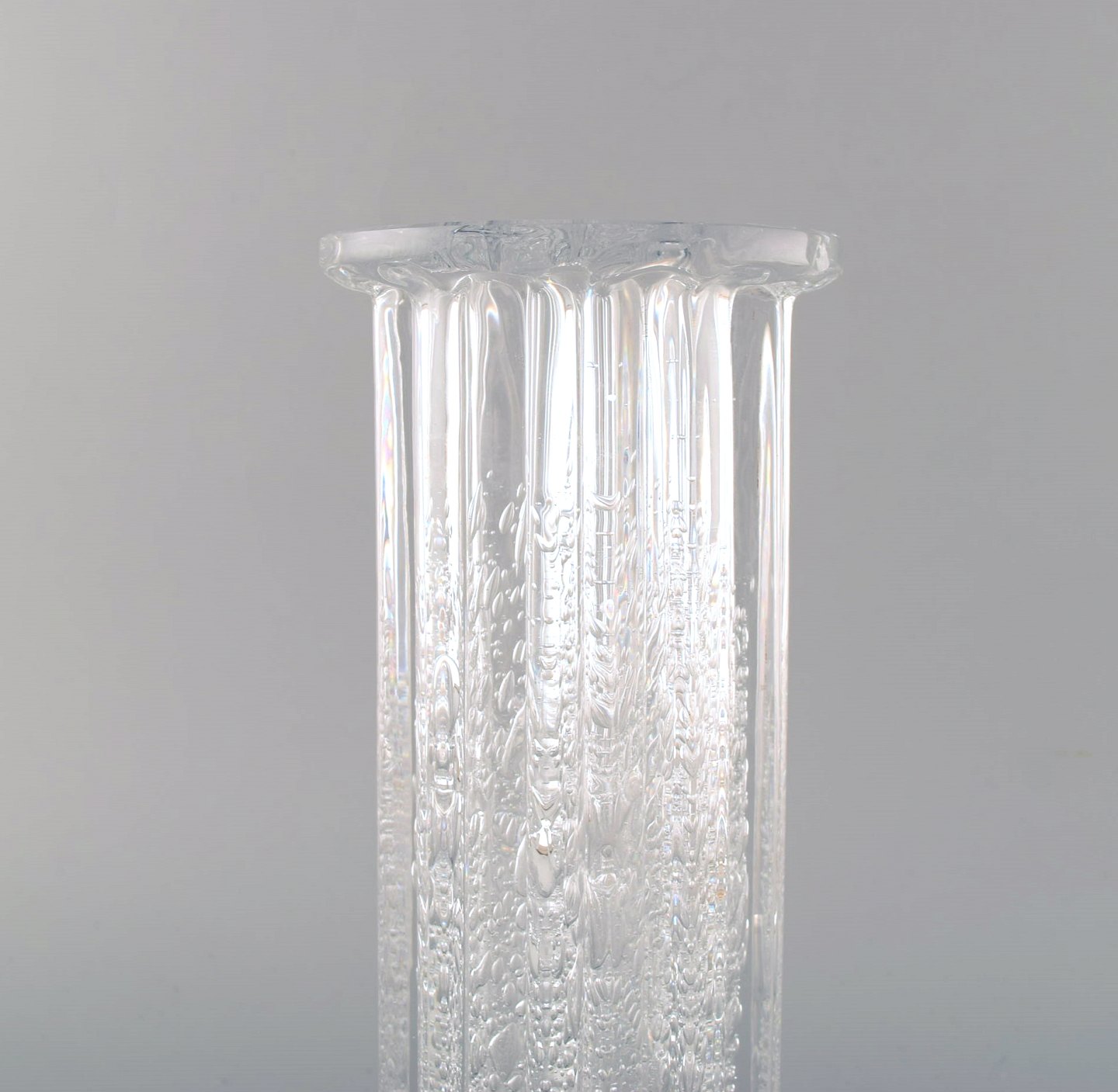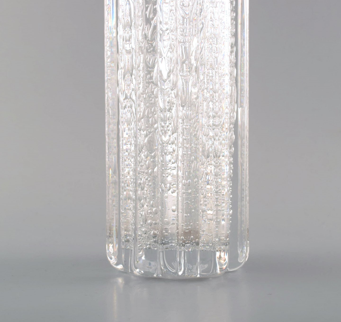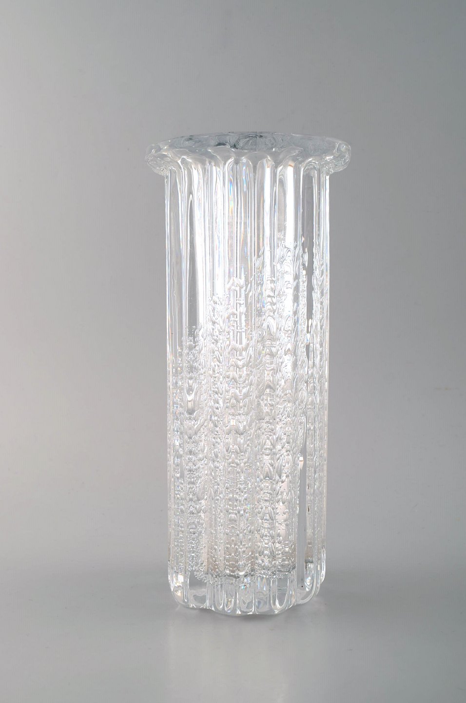 Willy Johansson for Hadeland Glasværk. Riflet "Atlantic" vase i klart kunstglas med bobler.