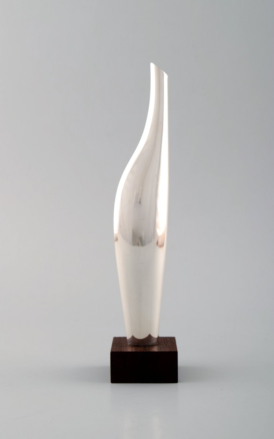 J. L. Hultman, svensk sølvsmed og designer tilknyttet Svenskt Tenn. Modernistisk vase i sterlingsølv på træsokkel. Ca. 1950. I flot stand. Stemplet. Måler: 20 x 4 cm.