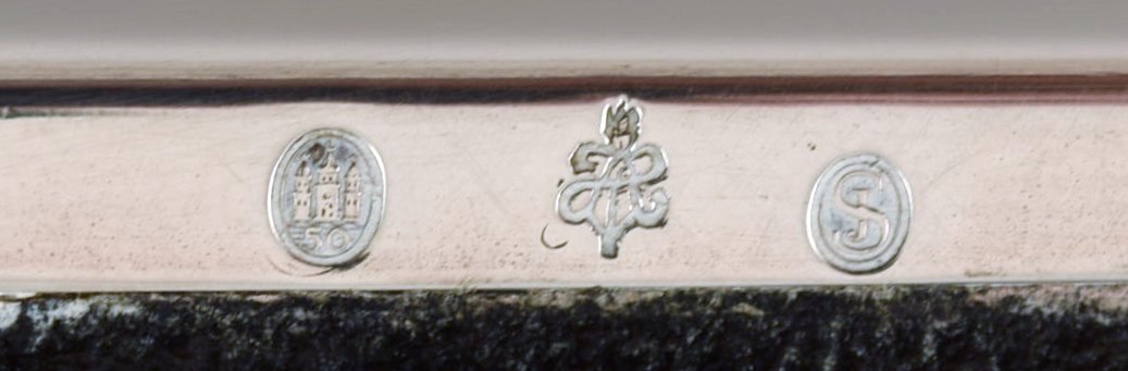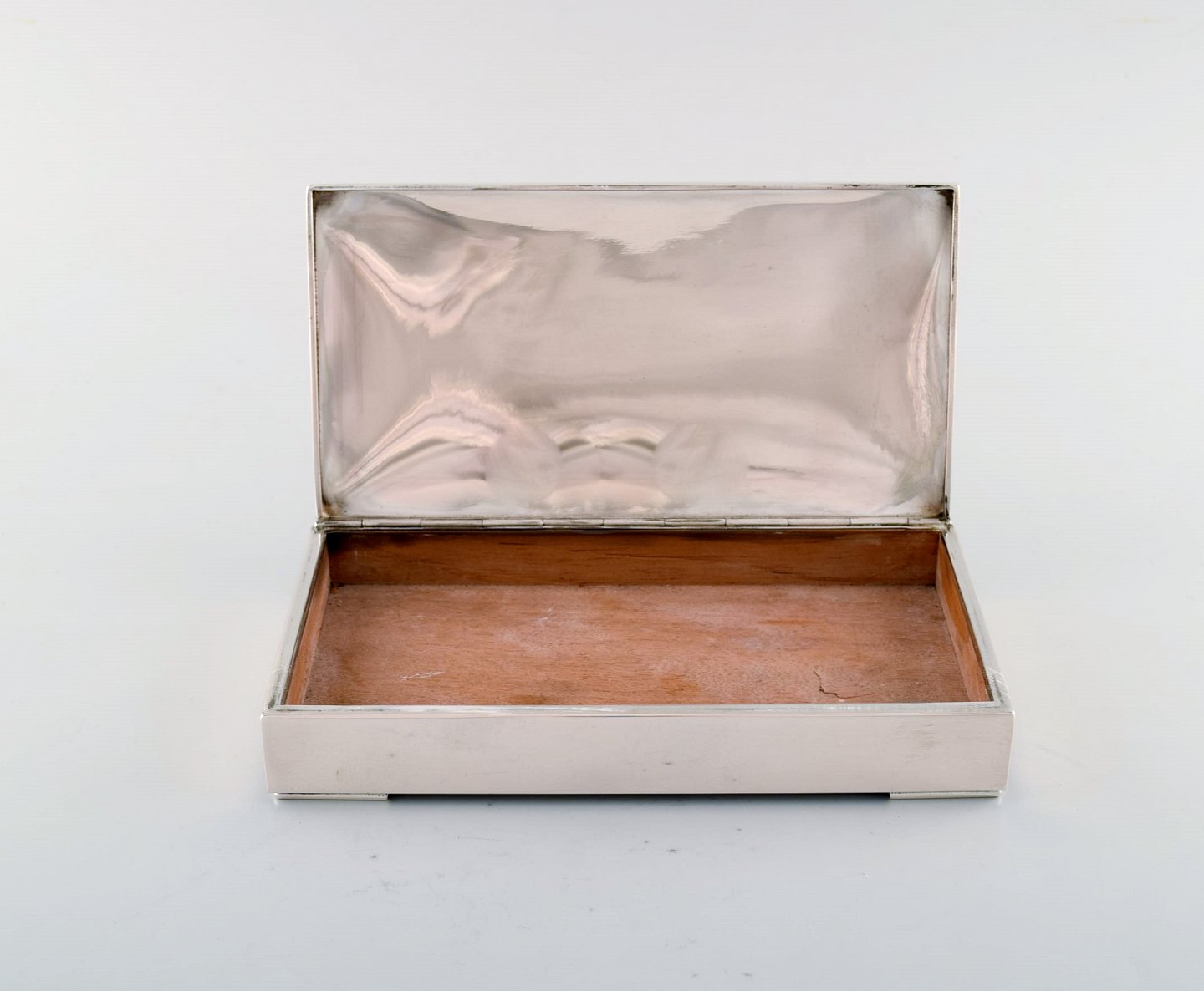 Dansk sølvsmed. Art deco smykkeskrin i tretårnet sølv med indlæg i cedertræ. Dateret 1950.